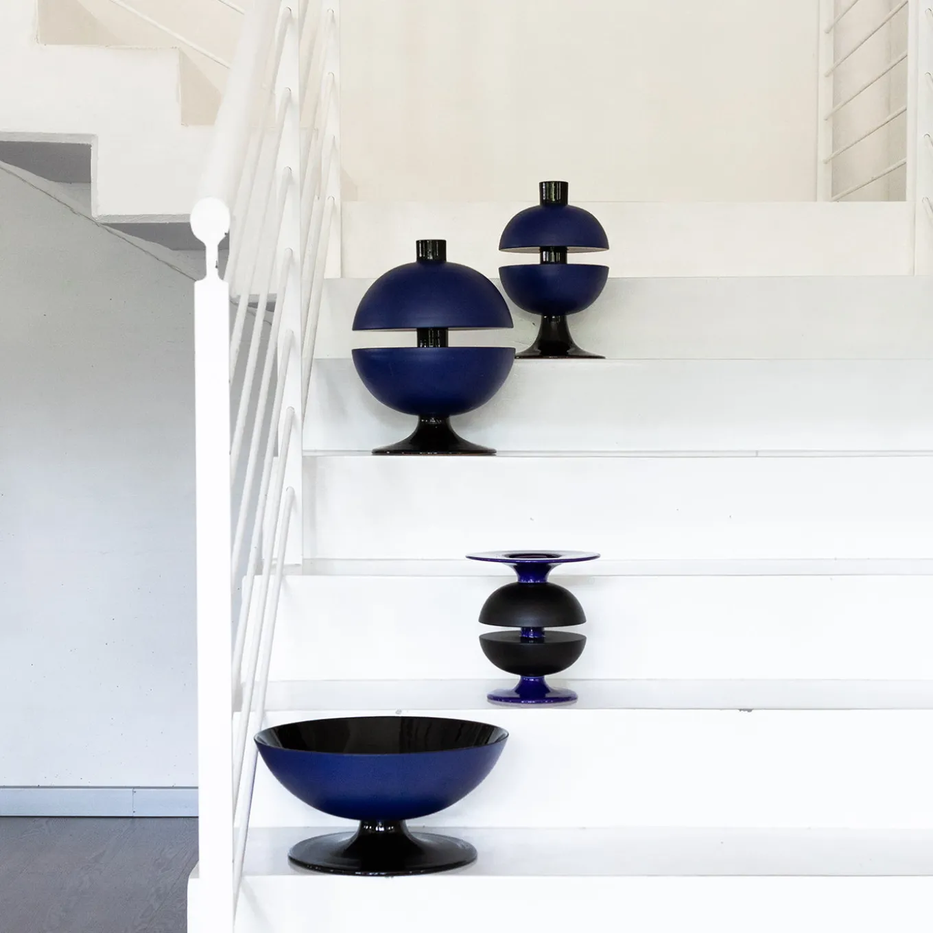 A collection of vases and decorative objects that celebrate the power of imagination and the technique of a great master. Hand thrown clay centrepiece. Finished in glossy black glaze for the interior and base and matte electric blue glaze for the exterior. Designed by Roberto Capucci