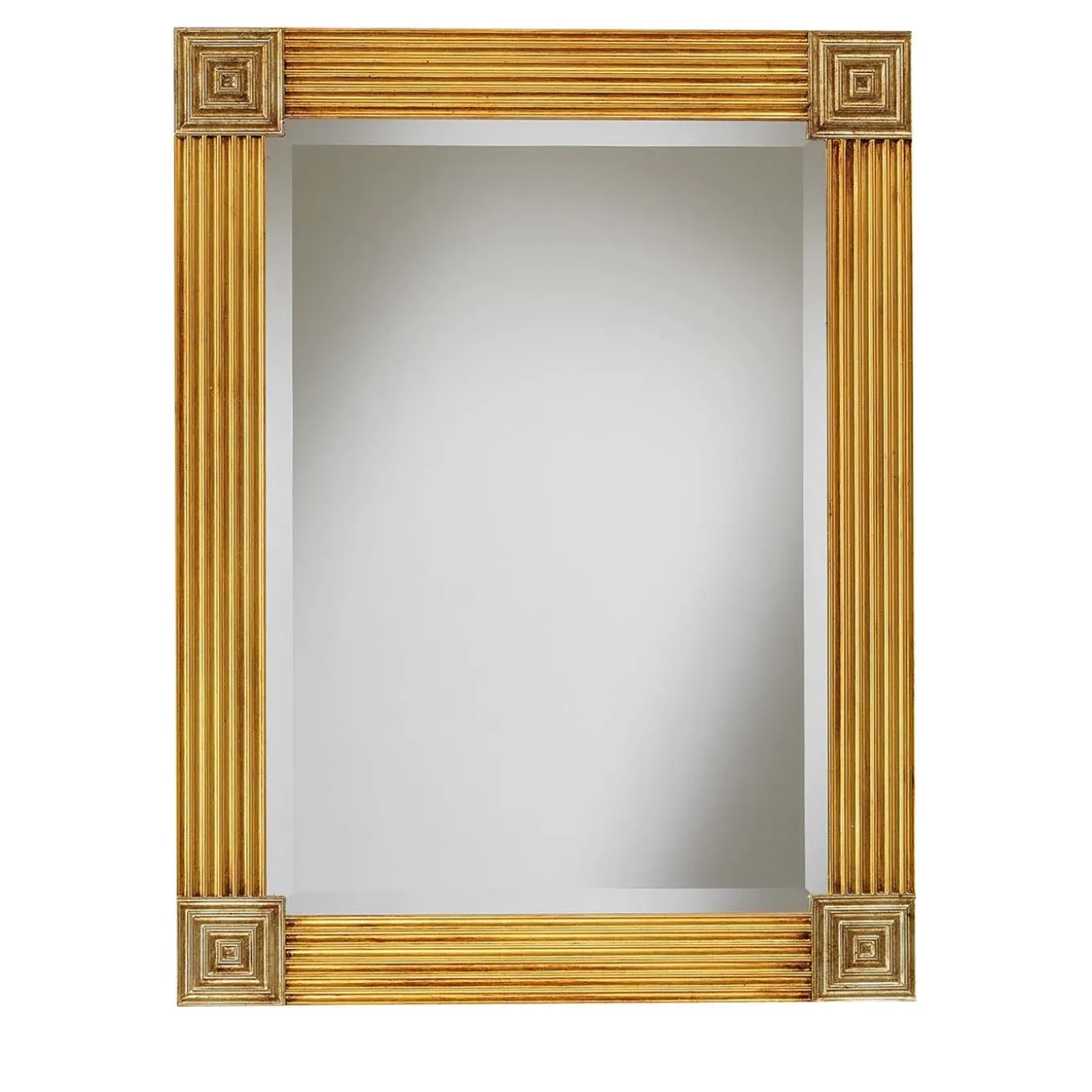 This superb wall mirror in Empire style will add a lavish accent to classic decors. Its wooden frame (2.7 cm thick) showcases a striped texture covered with antiqued gold leaf and contrasting angles coated with antiqued silver leaf – both the coatings are applied by hand. The rectangular mirror (approx. 50×70 cm) features beveled edges and it is fashioned of Italian crystal. Coming with mounting hooks, this striking piece can be custom made and requested in several color options. Please contact the Concierge for details.