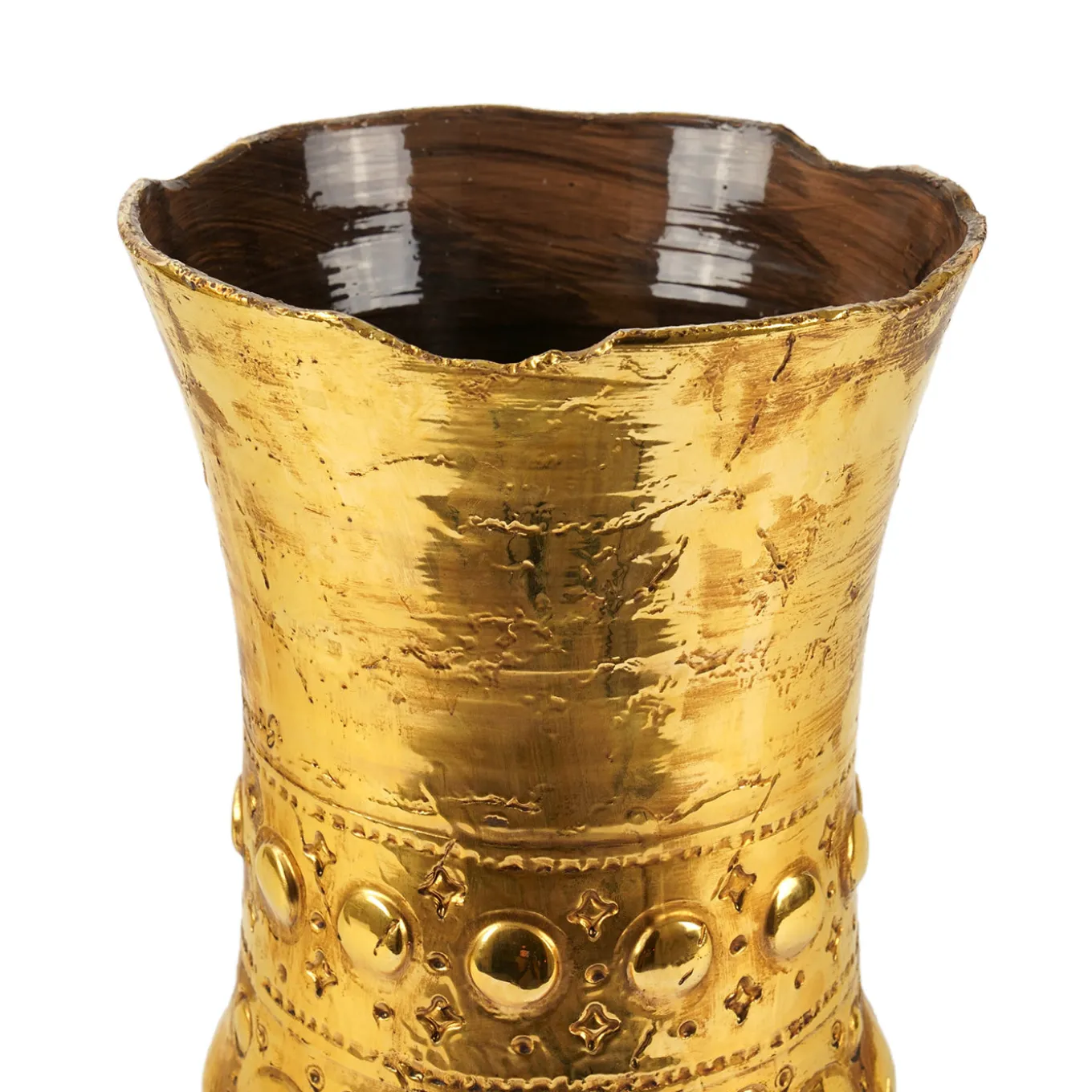 A sculptural vase shaped with a flared form and adorned with geometric reliefs and spherical motifs inspired by Renaissance bas-relief decoration. Crafted using a unique embossing technique and finished with a radiant layer of pure 24kt gold applied through a third firing method. The surface is antiqued manually with a natural blend infused with sandalwood ash, and the artist’s signature is engraved on the visible surface. Slight variations from the image may occur, highlighting its artisanal craftsmanship.