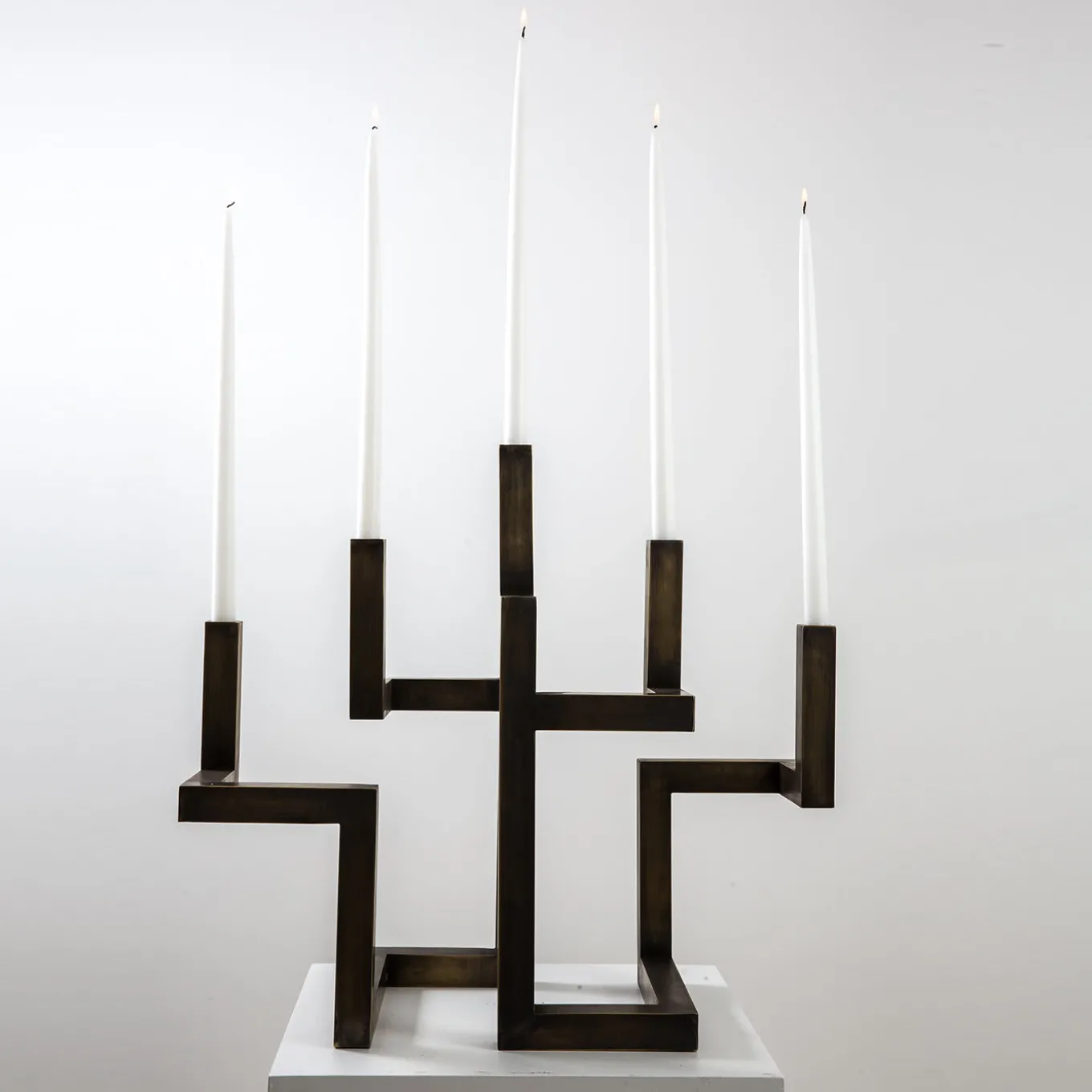 Five arms candelabra in bronzed brass entirely handmade in Italy by skilled artisans in the historical workshops of Rua Catalana in Naples. Its shape is a signature style by Neapolitan designer Francesco Della Femina, who conceived the piece as a a versatile ornamental centerpiece to compliment interior styles.