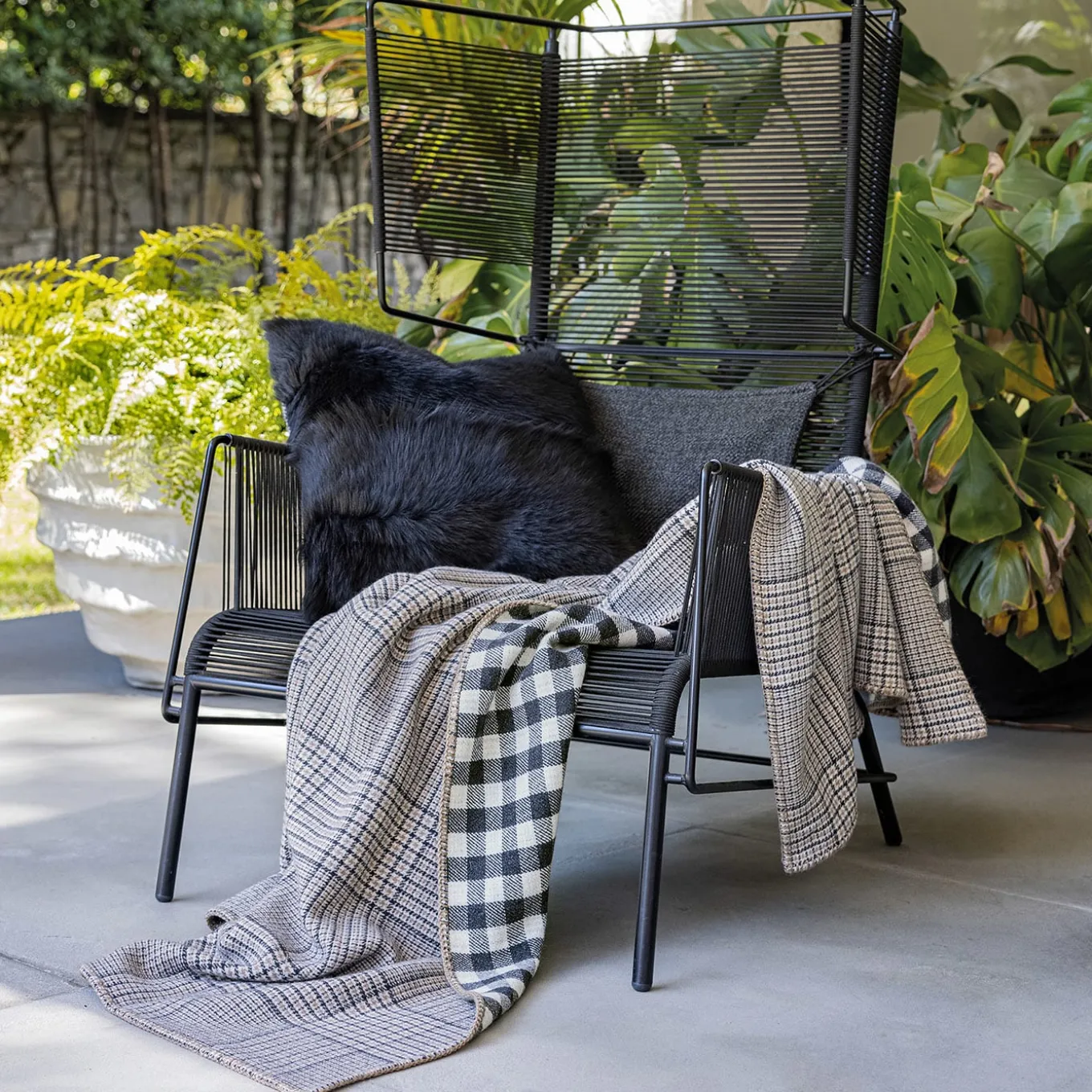 Polychrome cashmere yarns deftly intertwined up to achieve an intriguing jacquard checkered pattern lend this small blanket its fresh allure. The double-sided design and the contrasting blanket stitchings stress the design’s versatility and sartorial quality, making it a must-have for moments spent relaxing by the fireplace or taking a nap.