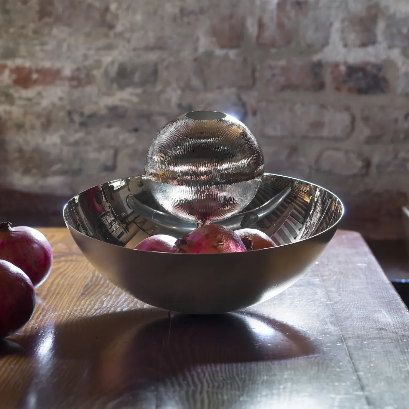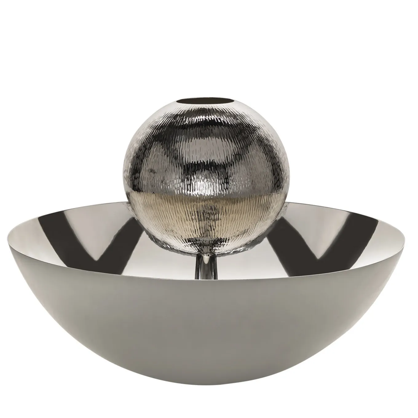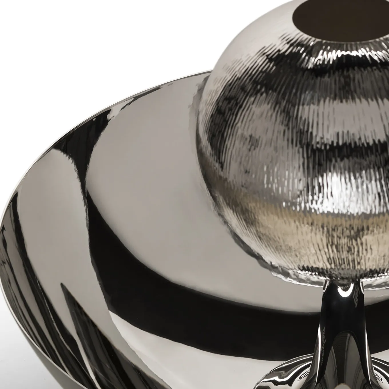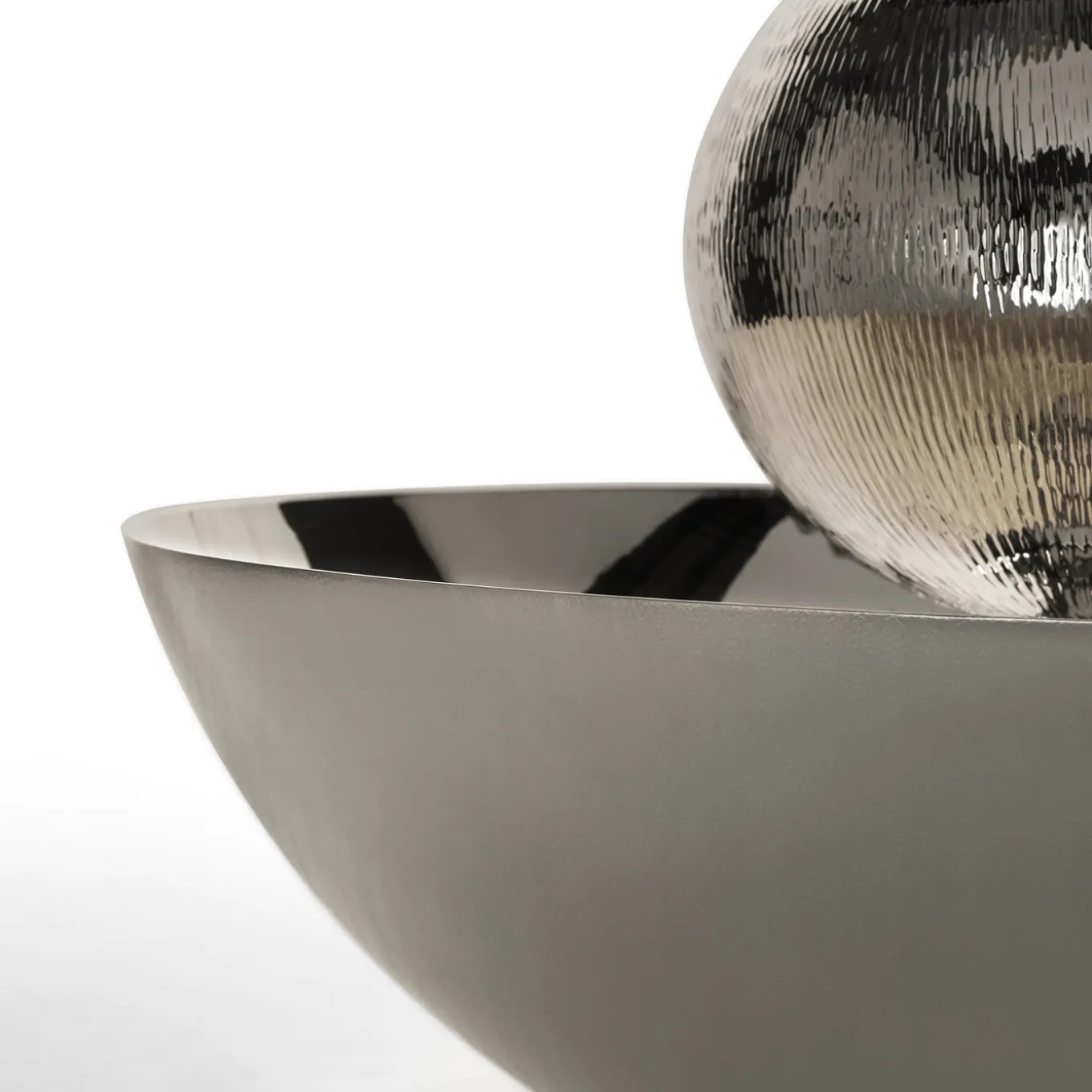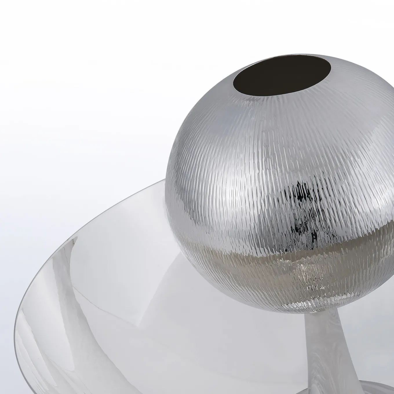 This unique centerpiece is part of a numbered series and will be sure to make a statement in any contemporary or modern home, thanks to its geometric silhouette and special gleam. Made of silver-plated metal with a varnish finish, its sinuous and smooth surface reflects the surrounding light in a unique way. Its circular base supports a sphere at its center that seem to float in midair. Evoking the cycle of life and the perpetuity of time, this piece will be a standout addition to an entryway or a dining room.