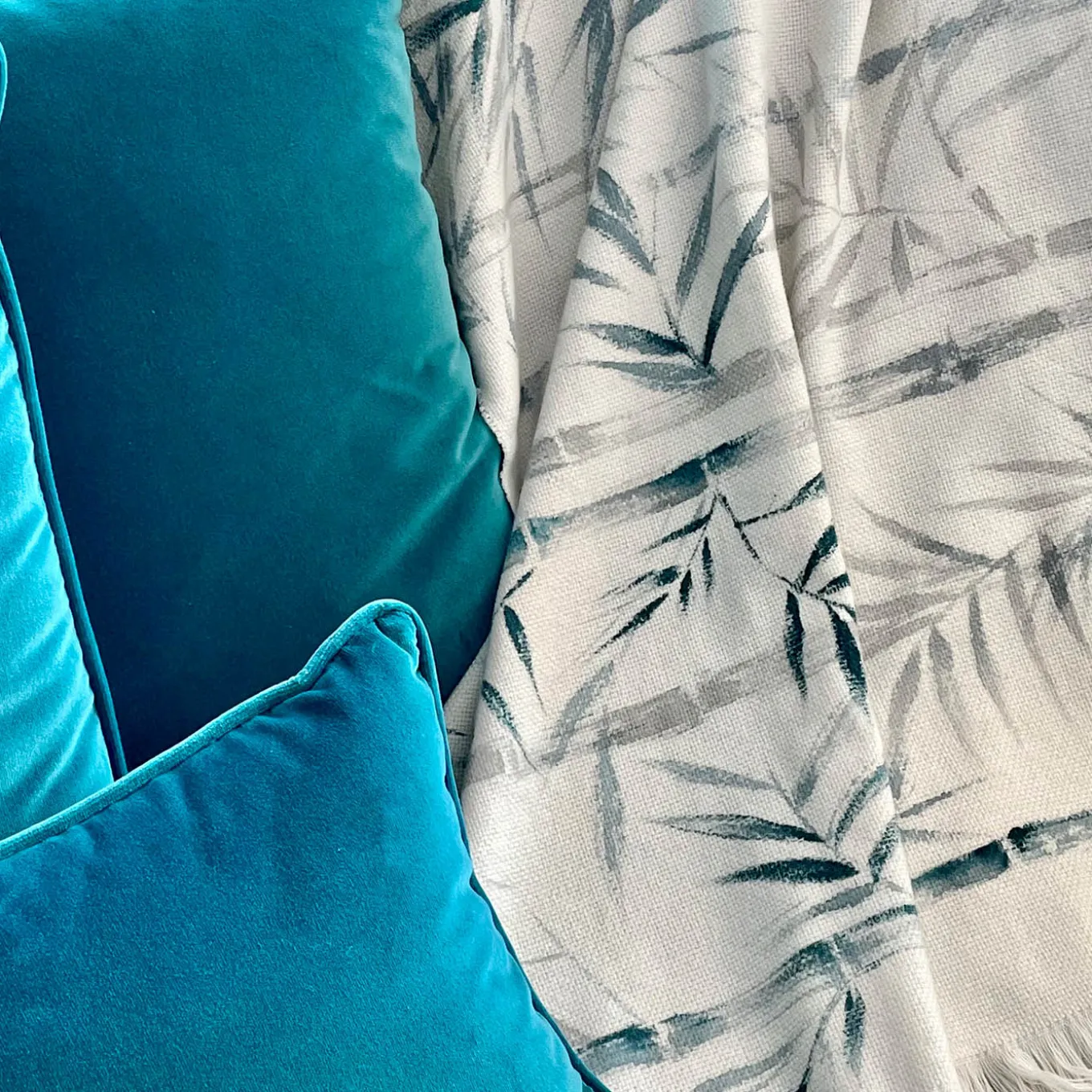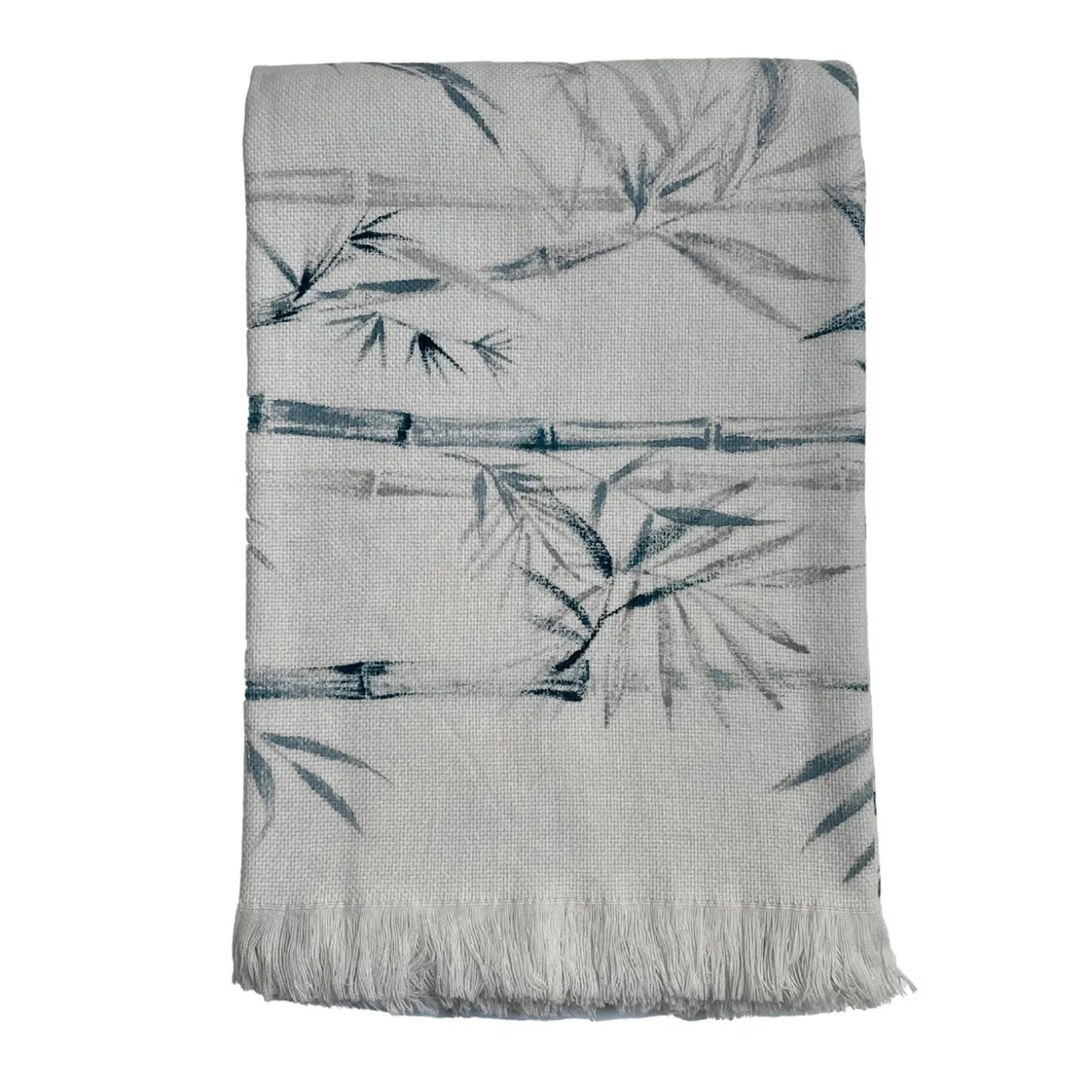 This superb blanket in fine off-white cashmere is a refined artisan piece coupling exceptional softness with unprecedented artistic flair. A graceful pattern of bamboo canes and leaves was deftly handpainted on its weft, woven by Como master weavers employing local techniques. Completed by a tone-on-tone fringed profile. Please dry clean only.