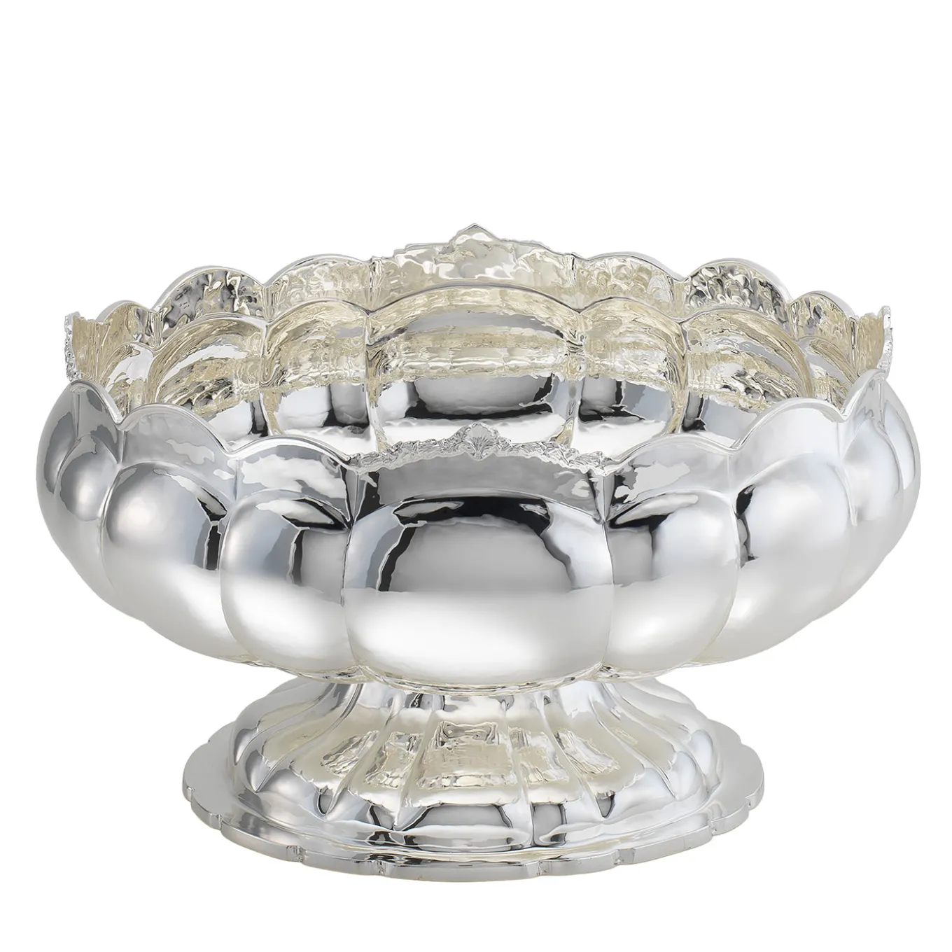 A tribute to the charm of a bygone era, this superb footed bowl is silver-plated with a stunning shimmering finish that enhances its elegant curves. The Baroque inspiration is evident in the ornate details on the scalloped rim and the finely lobed bowl and pedestal. An elegant statement piece on a dining room table or entryway console, this bowl has an exquisite heirloom quality that makes it the perfect choice for any gift-giving occasion.