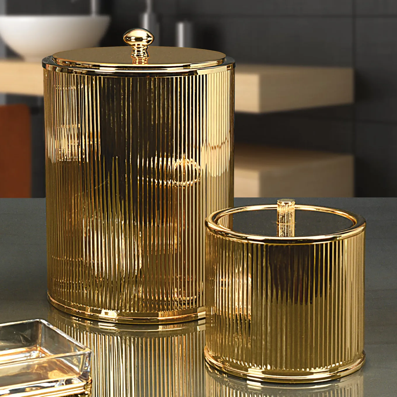 A glorious showcase of craftsmanship, this magnificent bathroom set is comprised of a small basket and box entirely handmade of brass preciously finished with 24k galvanized gold. Brimming with lavish allure, both pieces are decorated with a vertically grooved motif and completed with a refined and practical lid.