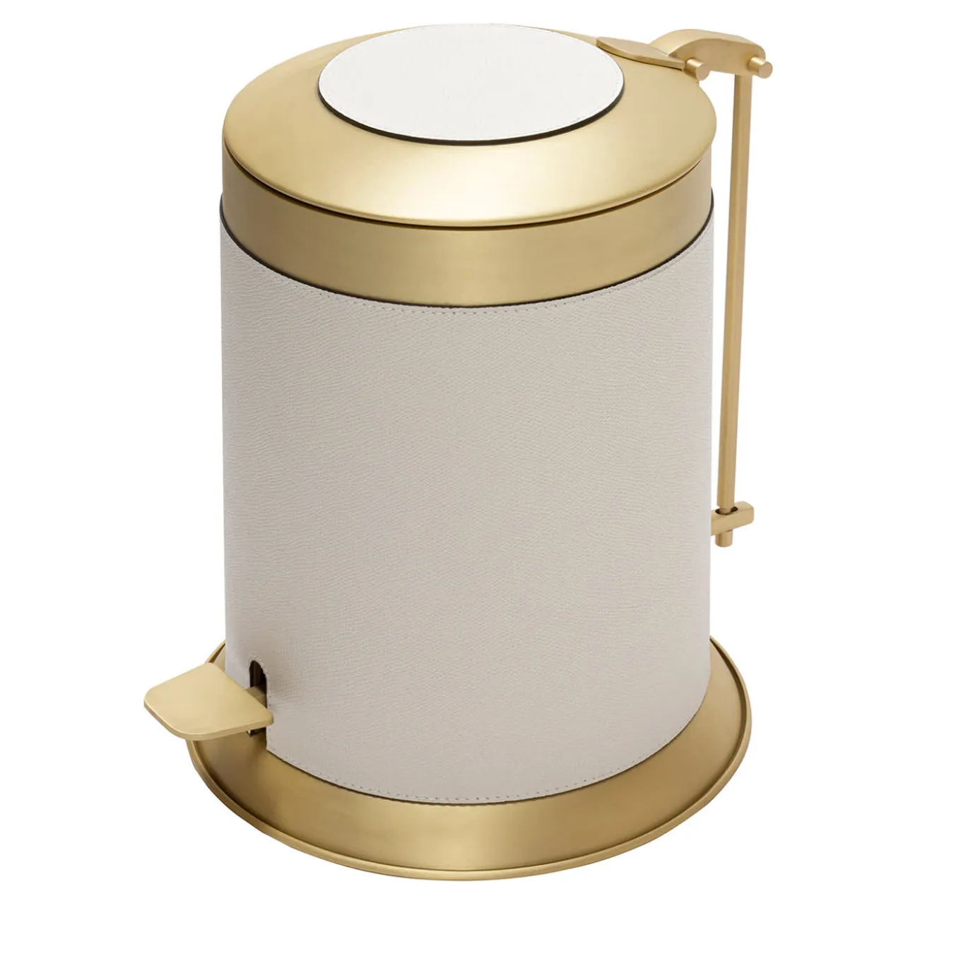 Metal structure available in different finishes featuring leather inserts. Removable dark-lacquered metal inner container for an easy cleaning.