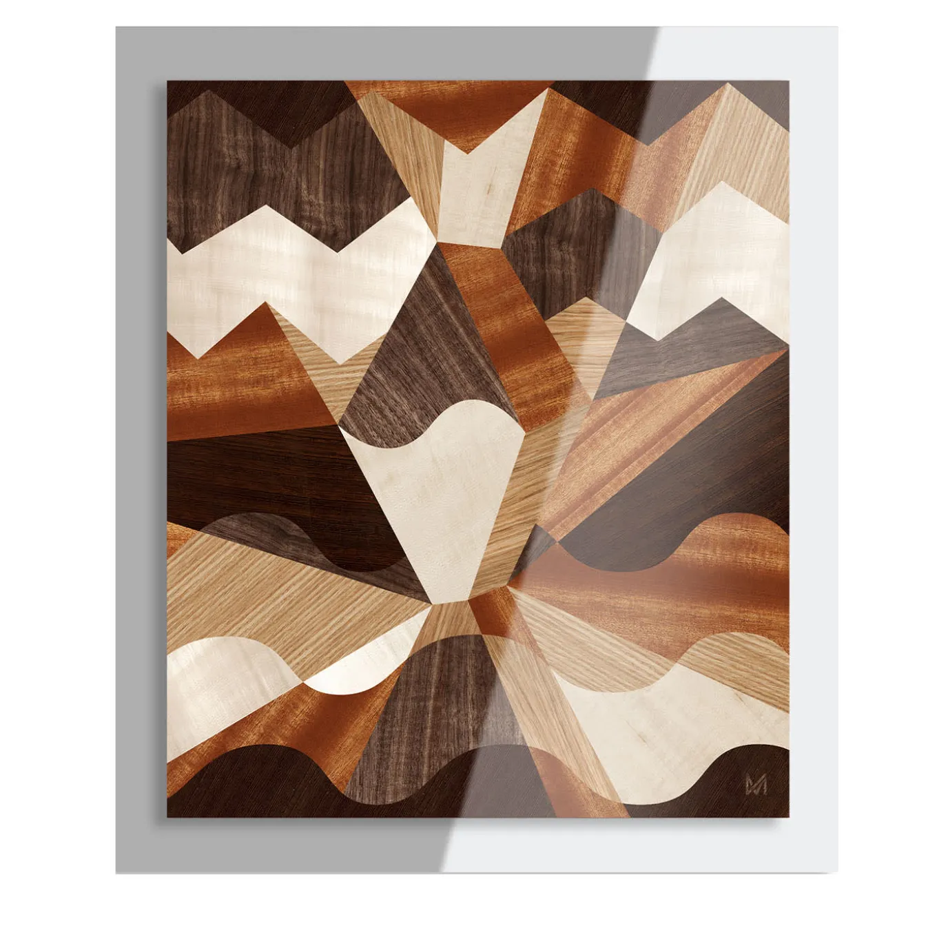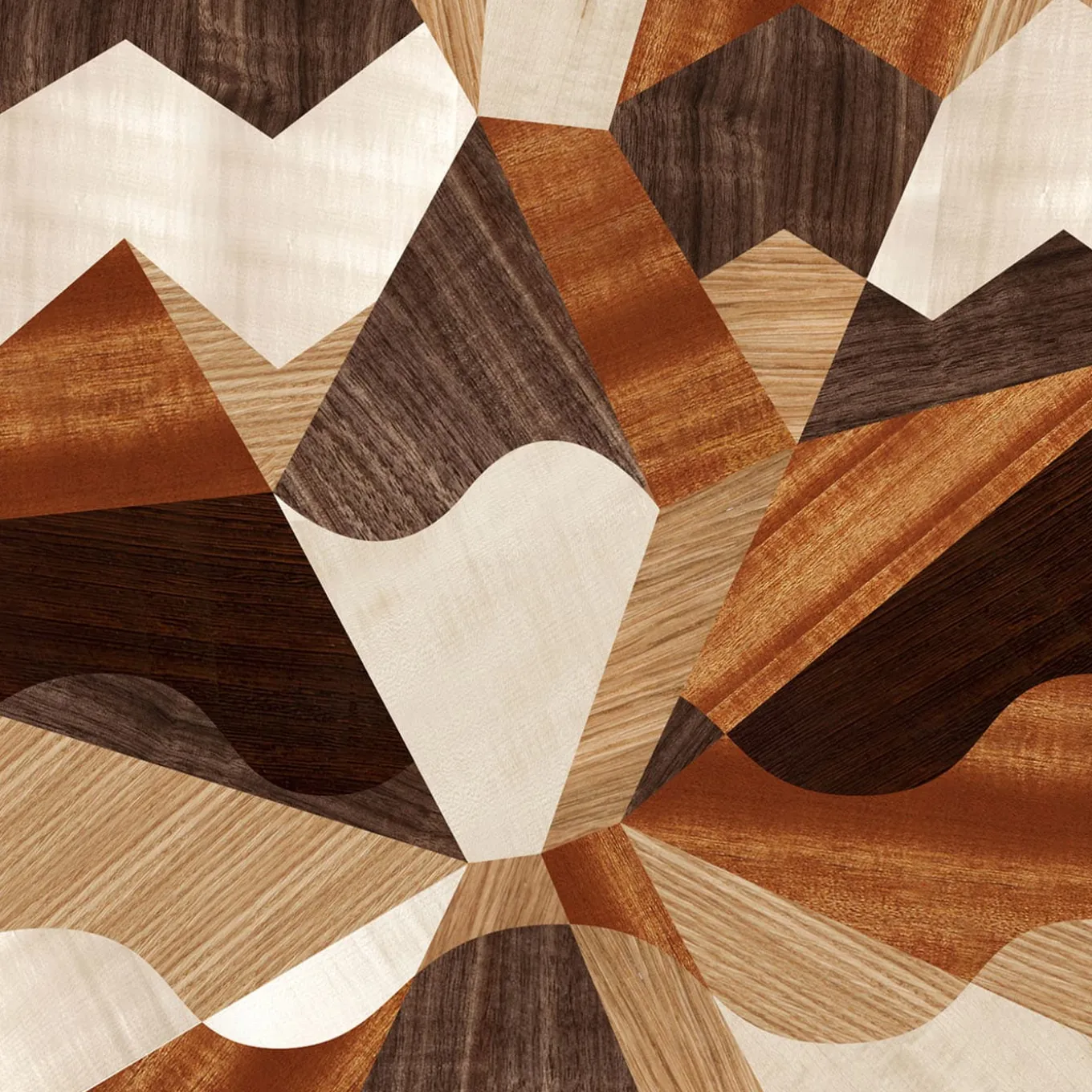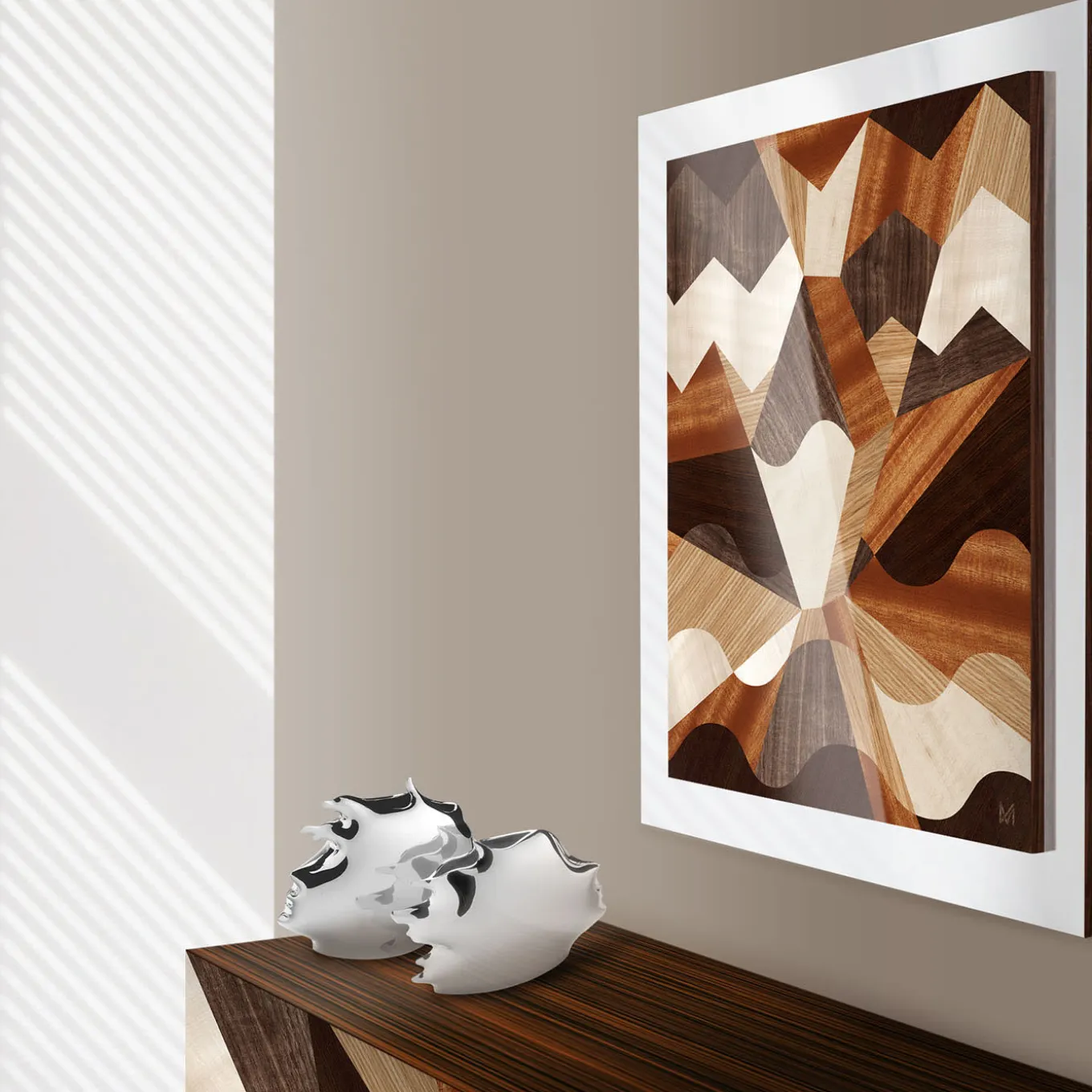 The eternal battle between good and evil every soul has to deal with inspired the striking abstract marquetry distinguishing this refined decorative panel. Carefully selected for their preciousness and tone, exclusive timbers are juxtaposed in an interplay of inlays rich in contrasts of both lines and shades. A mirror-finished polished steel frame completes the piece.