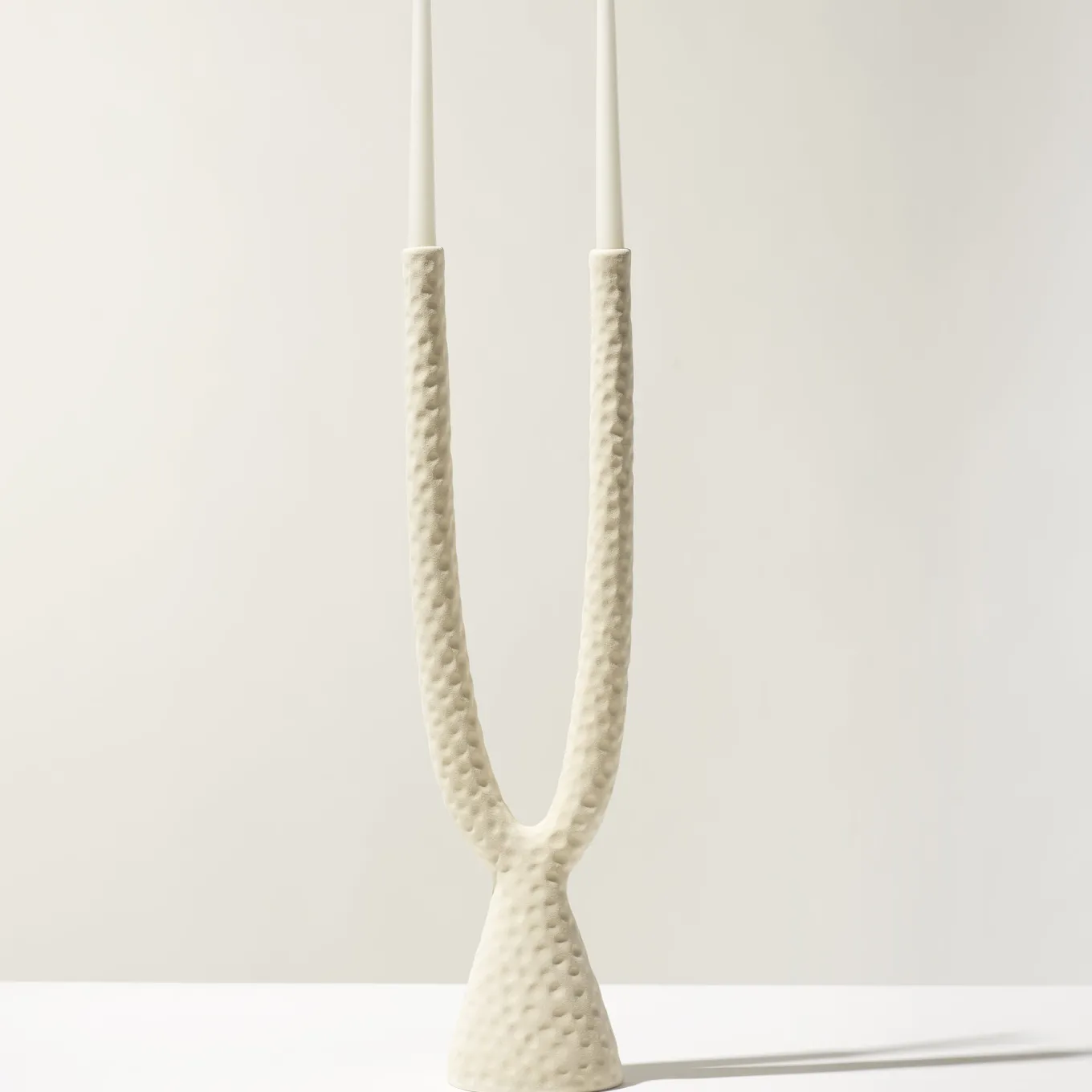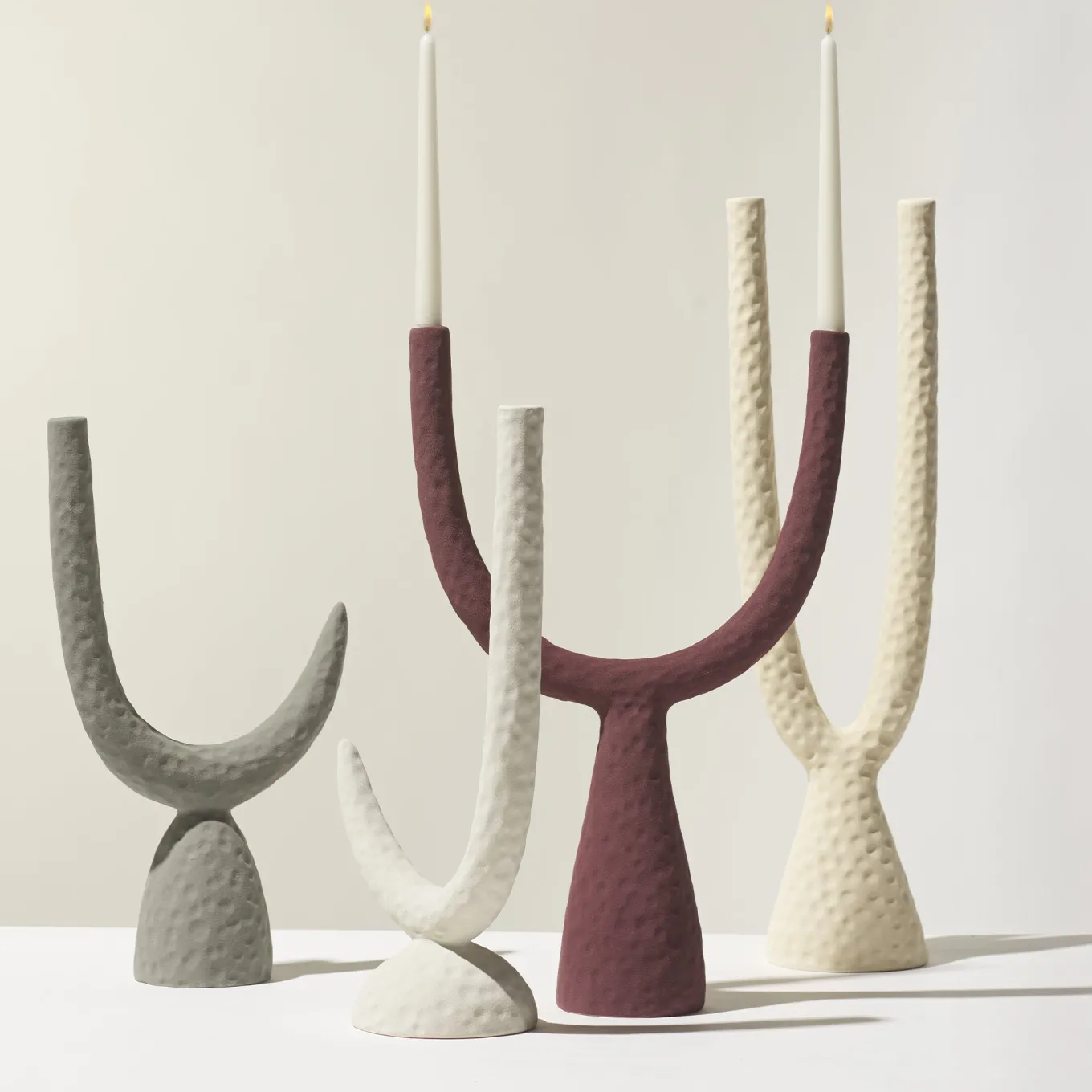 This candlestick features soft, rounded forms inspired by mid-century designs and reminiscent of morandian still life compositions. Crafted from molded clay and finished with a textured matte glaze applied by airbrush, its surface evokes the tactile quality of terracotta and aged copper vessels. The sculptural design encourages pairing with complementary vases and bowls to create harmonious decorative arrangements.