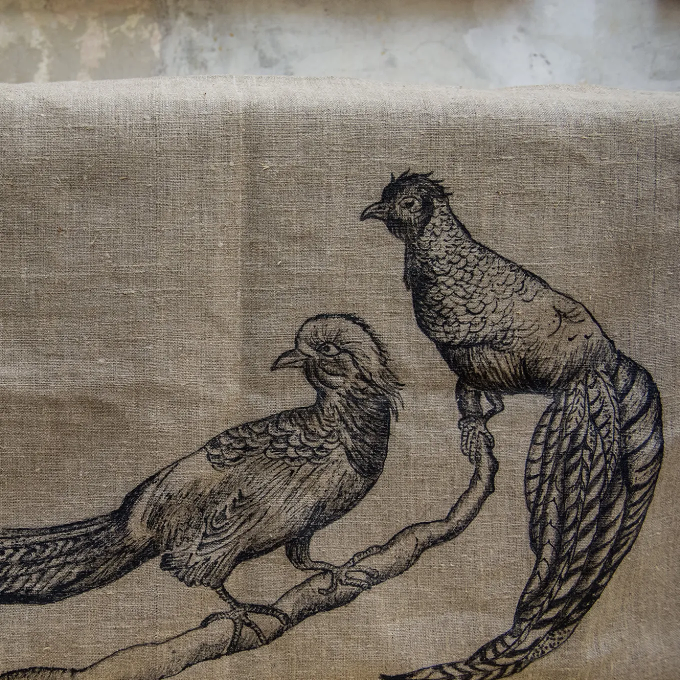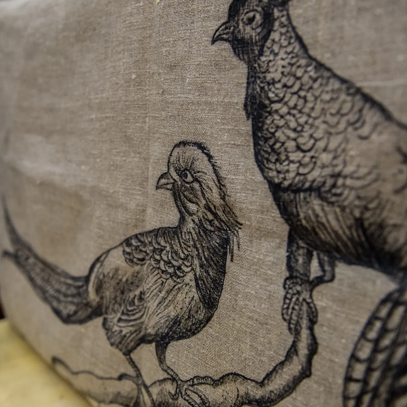 Painted by hand using a bas-relief technique, this cushion from the Birds & Flowers Collection is made of linens upcycled from the Italian military, characterized by a durable and tactile quality. The deep tones of graphite of the two birds can be felt to the touch, enhancing the textural allure of this singular piece. Slight variations and imperfections are a mark of its superior and exclusive handcraftsmanship. Padding not included.
