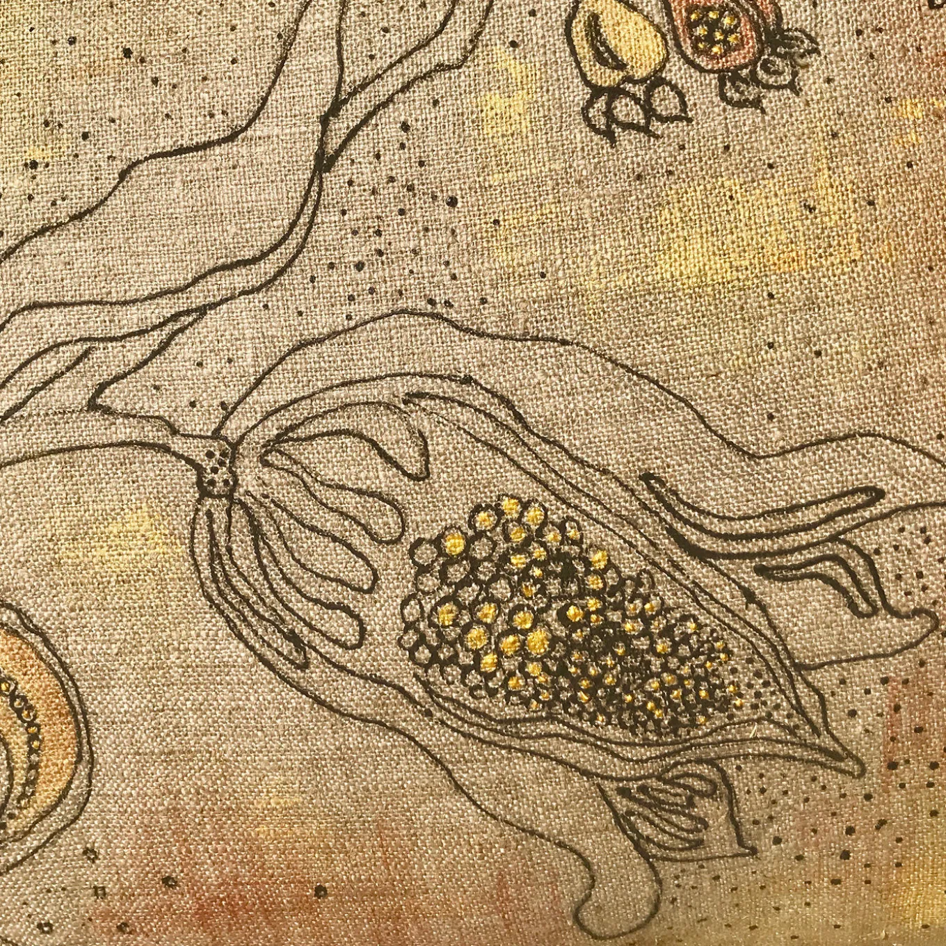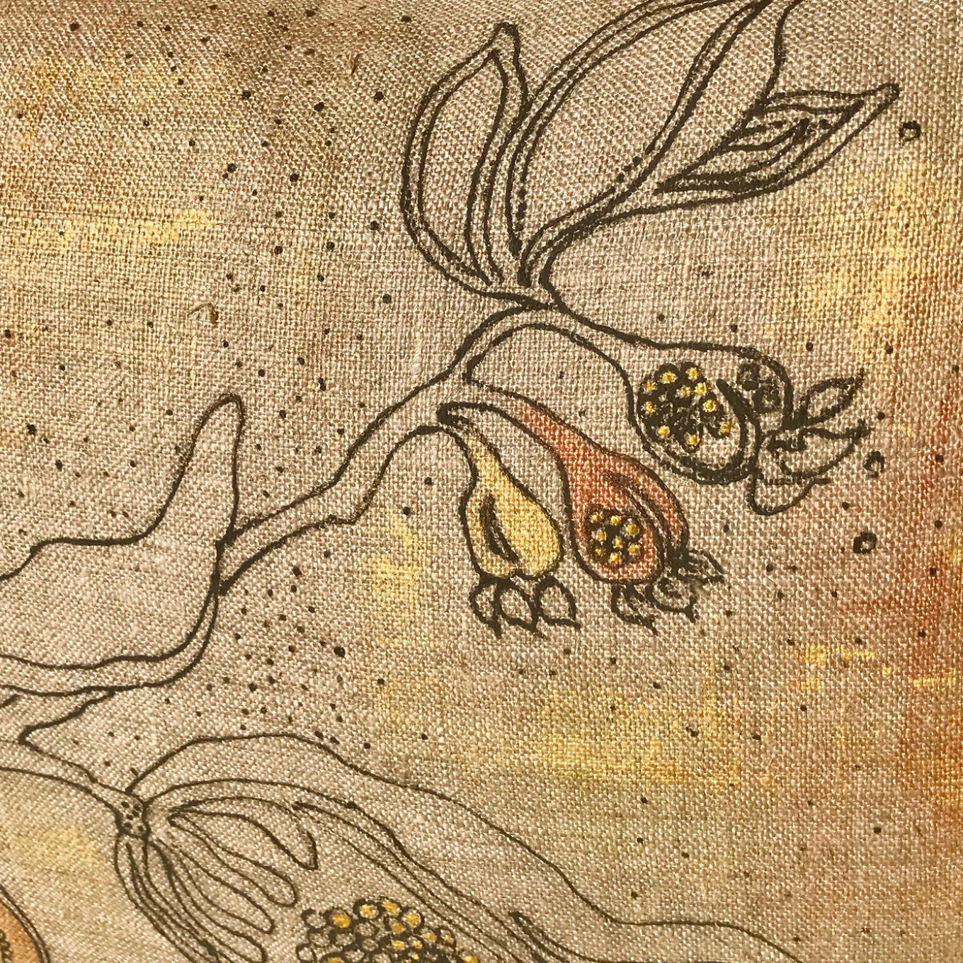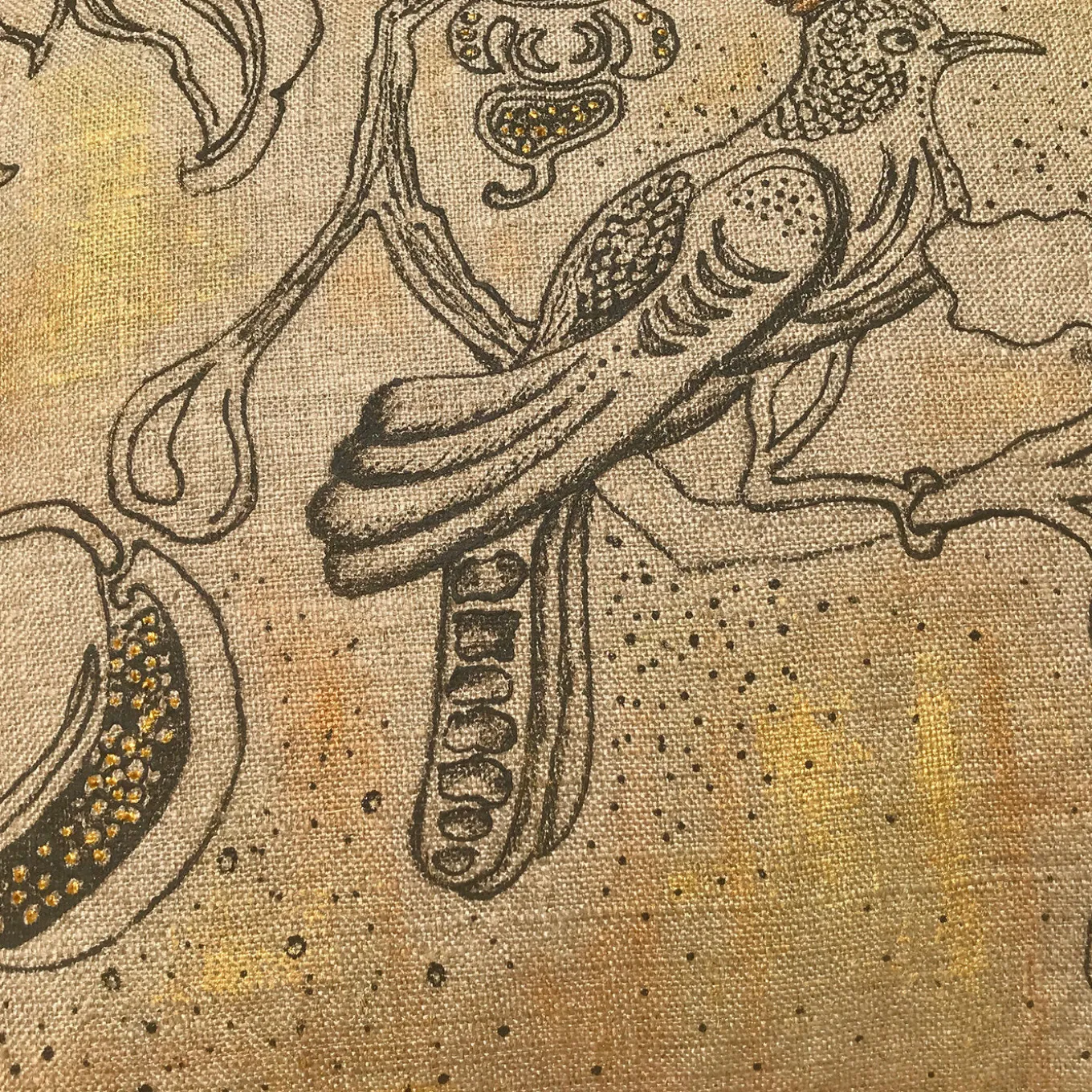 Painted entirely by hand on 100% raw linen upcycled from the Italian military using a special technique that creates a bas-relief effect, this cushion is characterized by a strong textural and visual allure. The poetic illustration of a bird perched on a branch with blossoming flowers is detailed with gold and copper colors. Part of a numbered series, each cushion is unique, featuring slight variations due to its handcrafted nature. Padding not included.