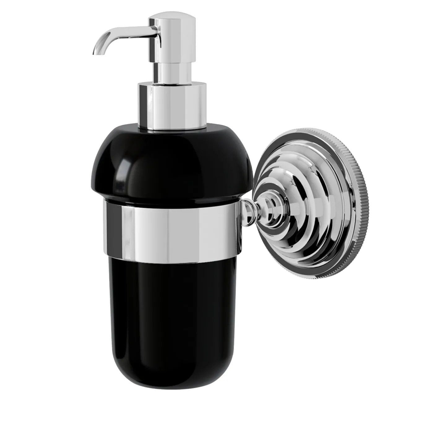 Refined design for an elegant brass and fine black ceramic wall-mounted soap dispenser with metal pump.