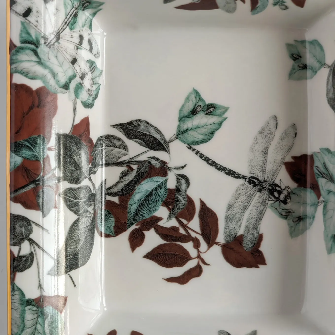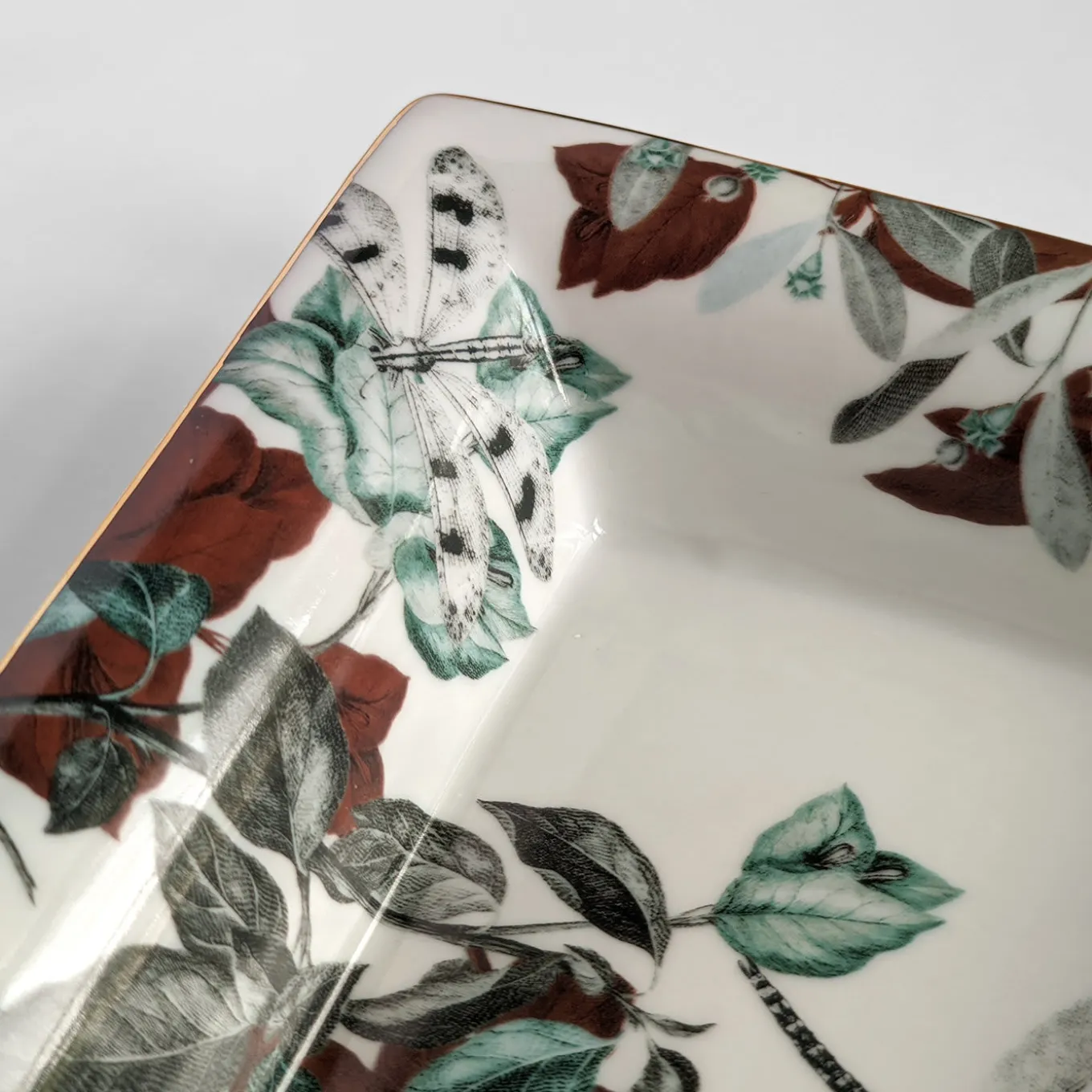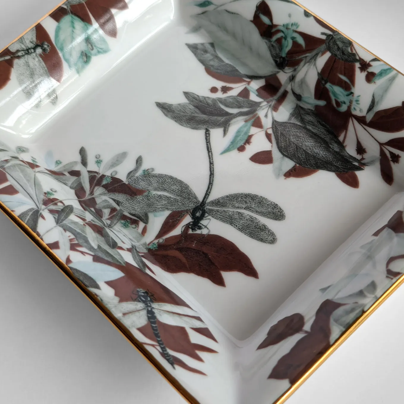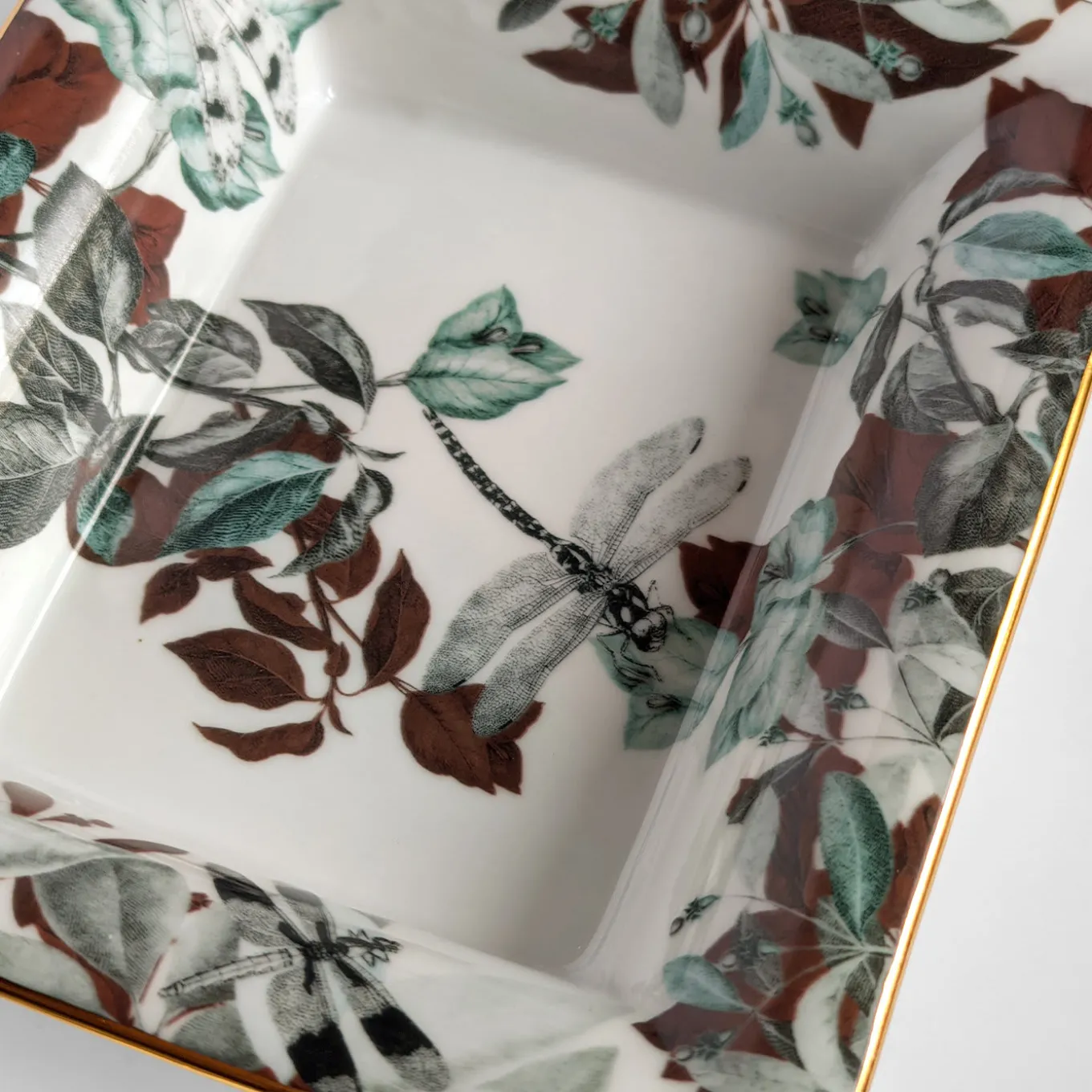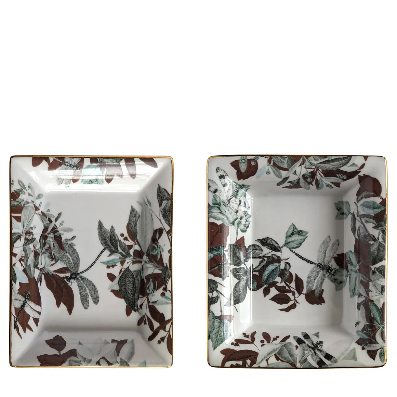 This fine porcelain set consisting of an ashtray (cm 15 x 11.5 x 2.5 H) and a vide-poche (cm 19.5 x 16 x 4 H) will make for a well-received gift for eastern culture aficionados. Sealed by a thin golden rim, their pure-white surface is adorned with lush foliage printed in green, rusty, and black hues, dragonflies depicted overhead. The set is named after the famous, eponymous pond in Jade Spring Park, China.