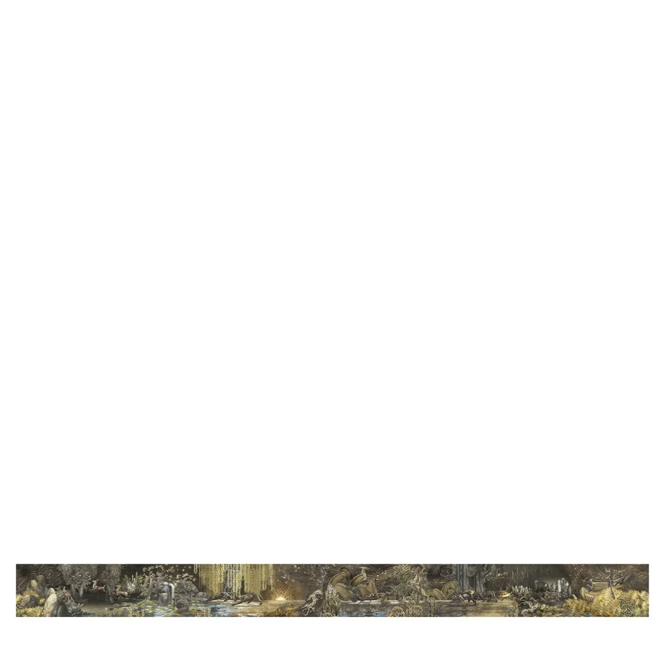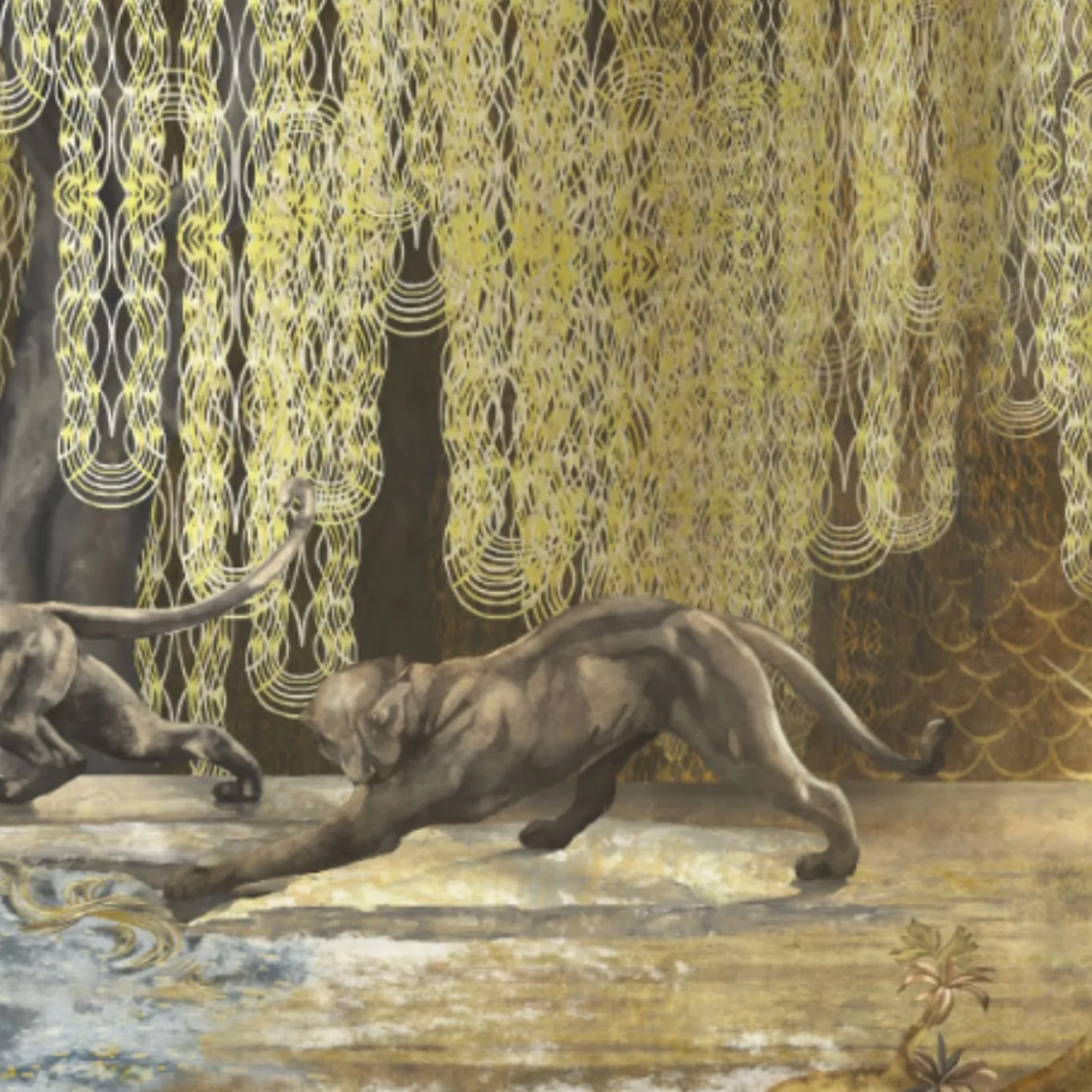The Black & Gold Gleaming Wildscape Polyester Wallcovering Fabric embodies a blend of contemporary flair and Art Deco inspiration. This fabric presents a mesmerizing urban jungle that harmonizes primeval elements with a metropolitan skyline. The piece features golden glows and modern forms that create an alluring depiction of a contemporary Eden, showcasing sculptural figures, tattooed animals, and an interplay of architecture and lush vegetation. The installation process is straightforward with a simple stretching technique that ensures a seamless look while enhancing breathability and sound absorption. The price is per square meter, allowing for customization in coverage. An alternative height of 270 cm is available. Please contact the Concierce for additional information.