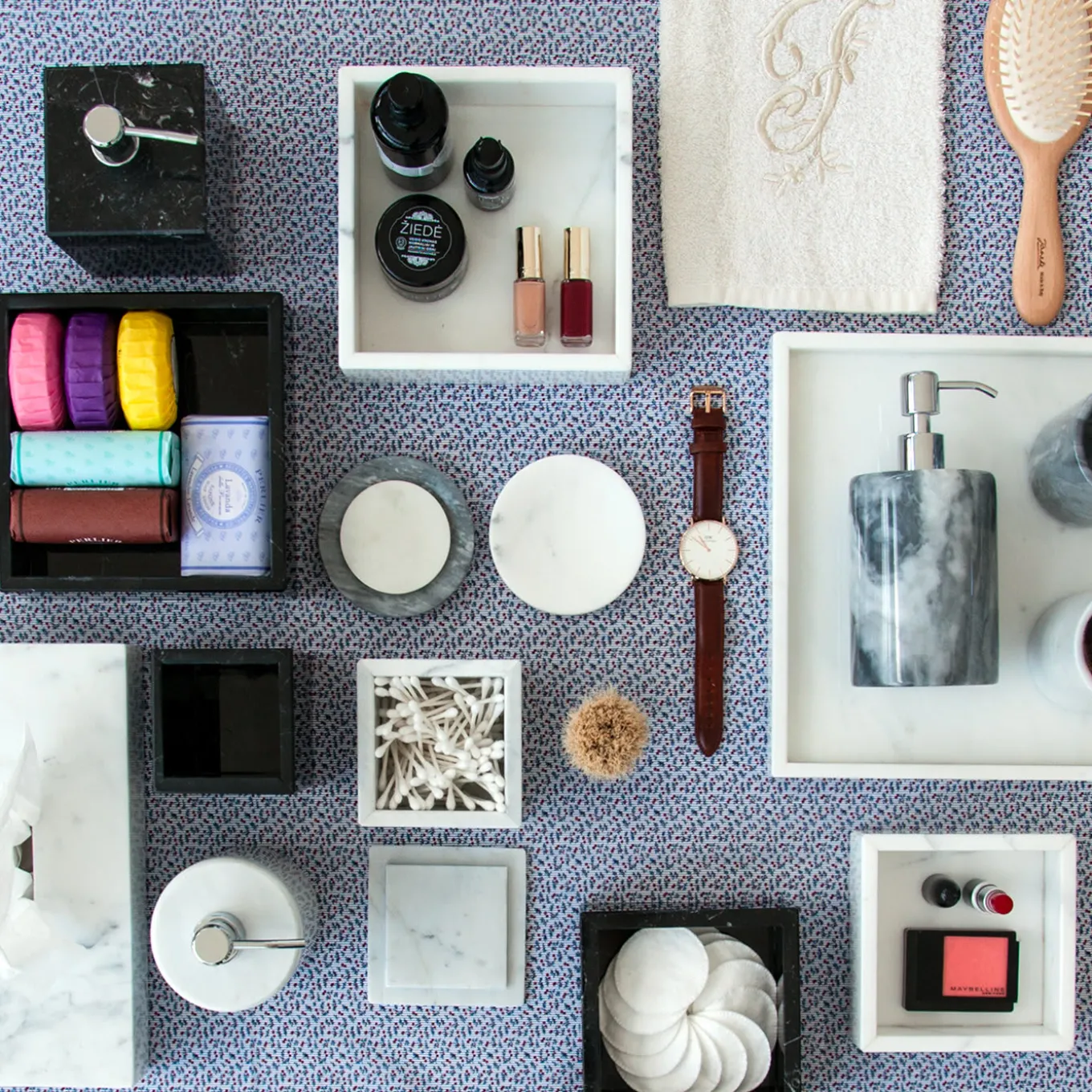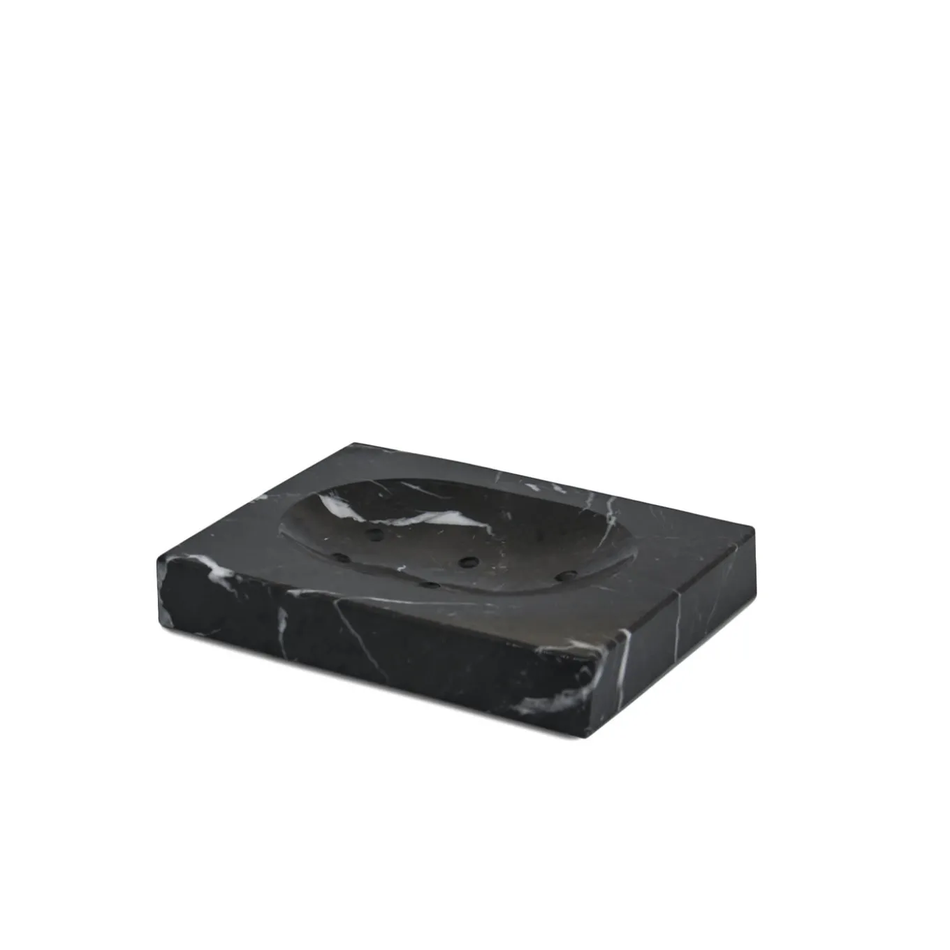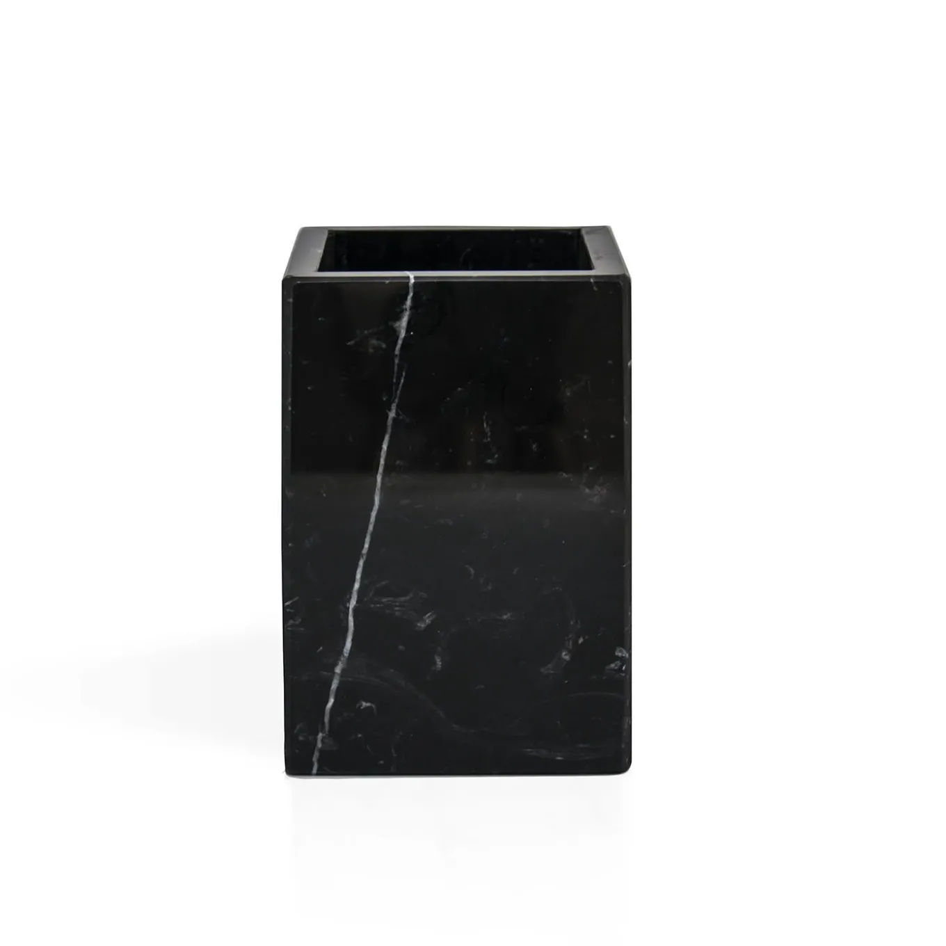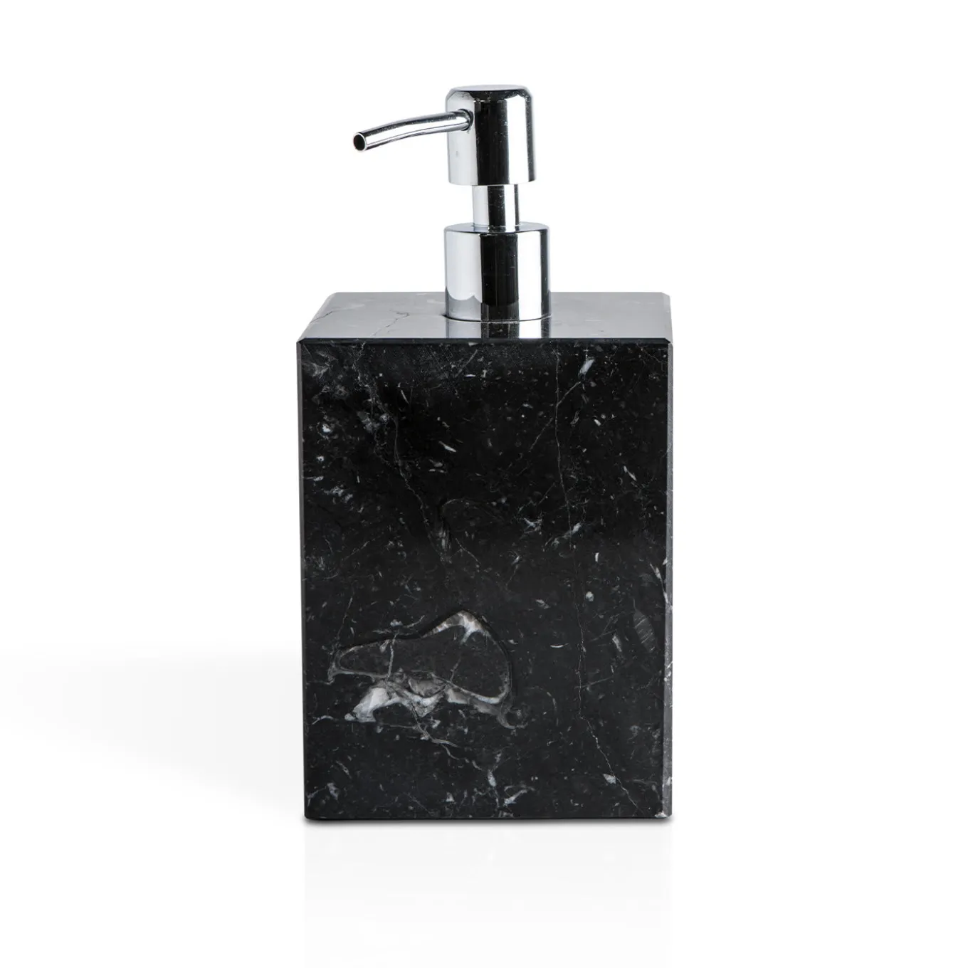 Striking and elegant, this bathroom set in black marble is a superb addition to an elegant home. Its combination of minimalist silhouettes with the opulence of precious stone creates a striking effect that makes this set a stunning choice for any home. The set includes a soap dish (10 x 13 x 2 cm), a box with lid (8.5 x 8.5 x 9.5 cm), a toothbrush holder (8.5 x 8.5 x 12.5 cm), and a soap dispenser with metal pump.