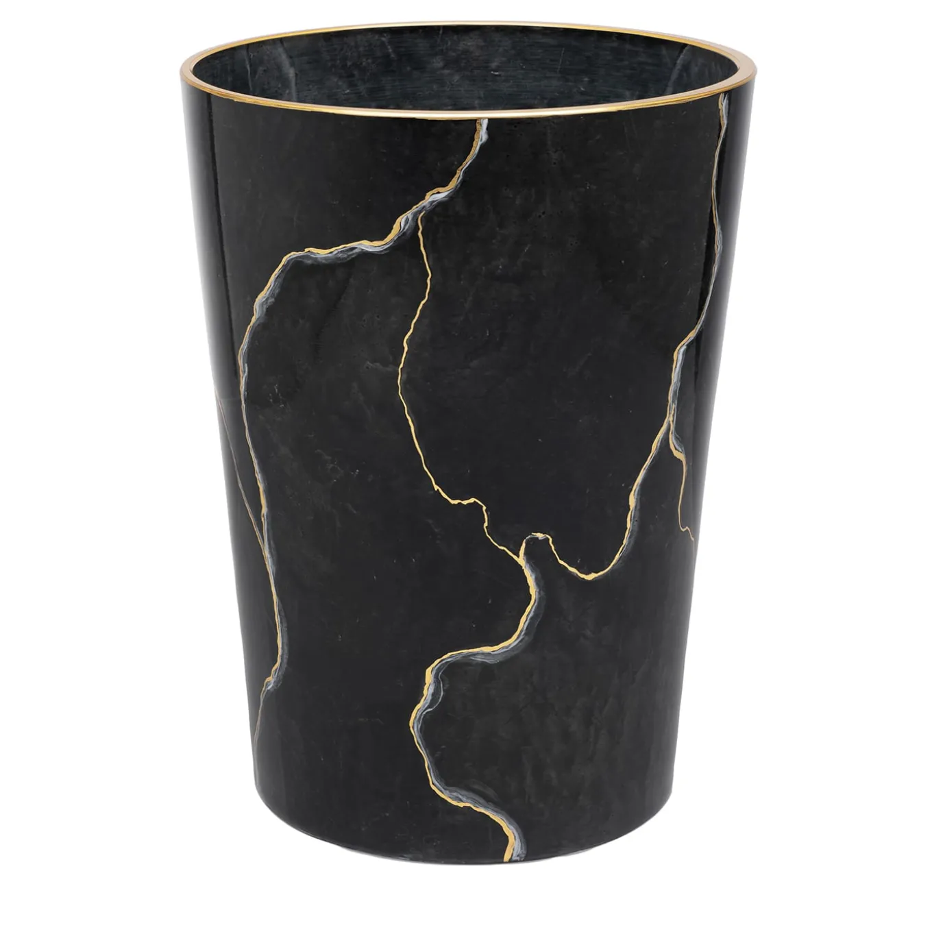 A striking fusion of practicality and artistry, this handcrafted dust bin doubles as an elegant vase. Featuring hand-blown glass meticulously painted to emulate the timeless beauty of Portoro marble, it boasts delicate inlays of gold leaf, each applied with precision for a refined finish. Personalization options include alternative colors inspired by other precious marbles, adding versatility to this sophisticated creation.
