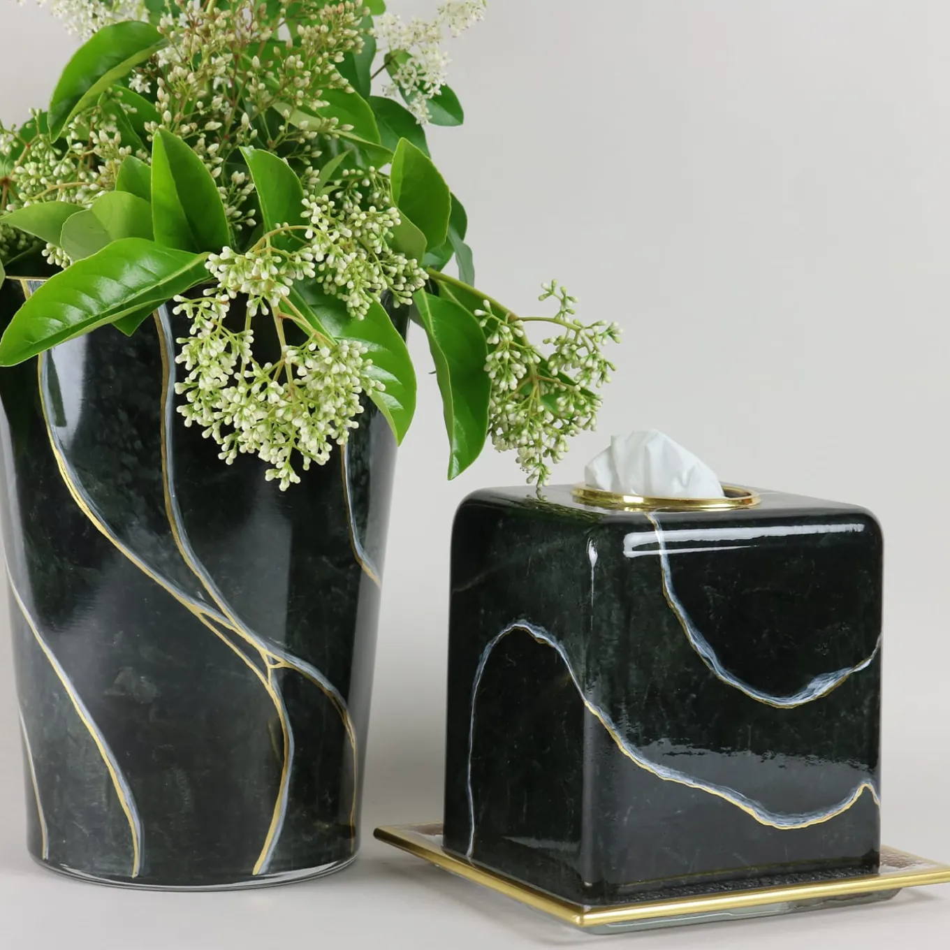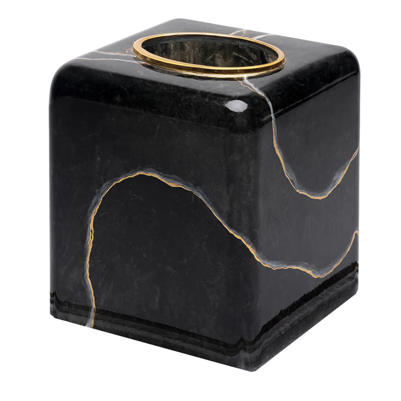 Exquisitely handcrafted from hand-blown glass, this Kleenex box cover evokes the opulence of Portoro marble through intricate freehand painting. Embellished with refined gold inlays, it combines artisanal craftsmanship with modern sophistication. The square design offers both functionality and a striking aesthetic. Customization options include other fine marble-inspired colors. A matching tray, sold separately, complements the piece for a cohesive and elegant display.