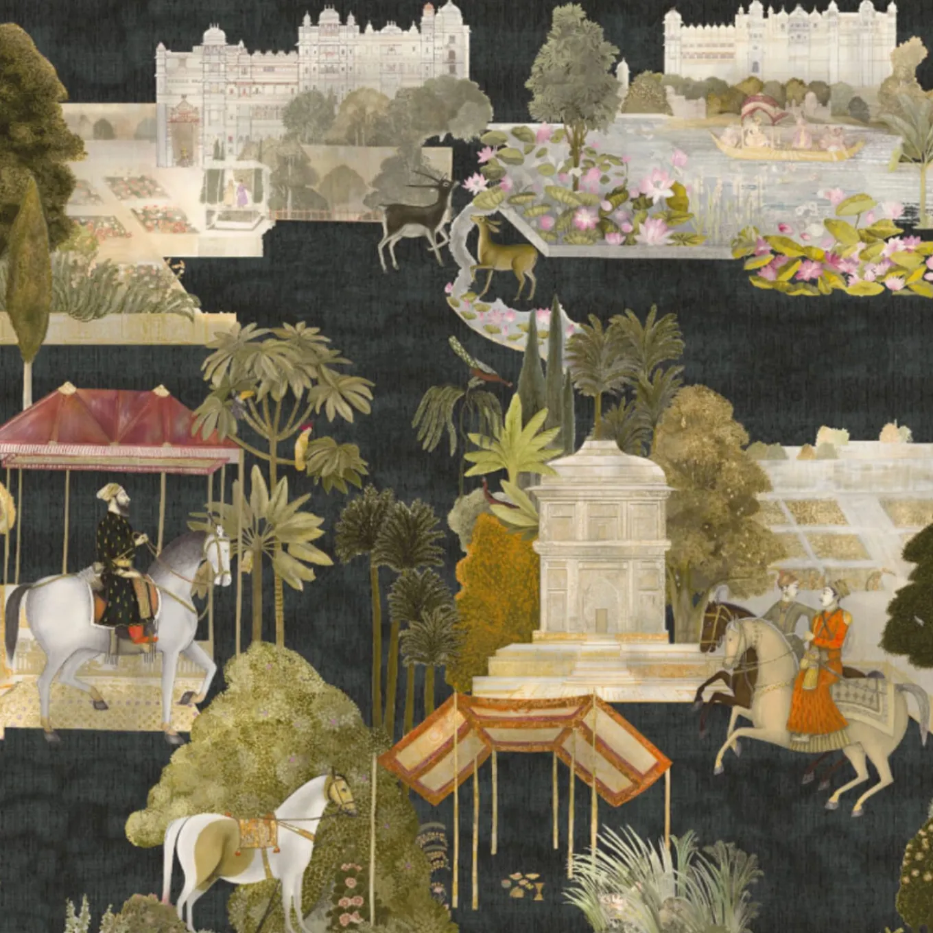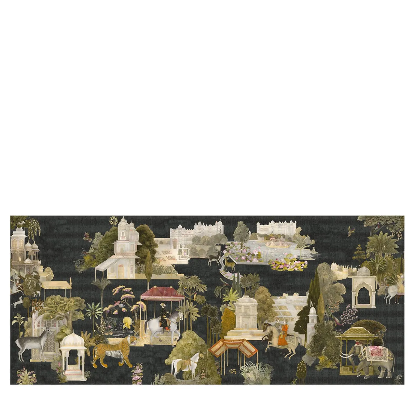 The Black Rajasthan Cotton Wallcovering Fabric features a striking array of figurative elements, including floral, botanical motifs, and intricate depictions of animals, architecture, and cultural scenes. Each design invites viewers into a vivid world of silks, spices, and rich traditions, transforming any space into a captivating tapestry of color and life. Specifically designed for effortless installation, this fabric can be simply stretched across walls, creating a seamless and elegant look. The price is per square meter, allowing for tailorization to fit various wall dimensions. It is also available in an alternative height of 270 cm. Please contact the Concierge for additional information.