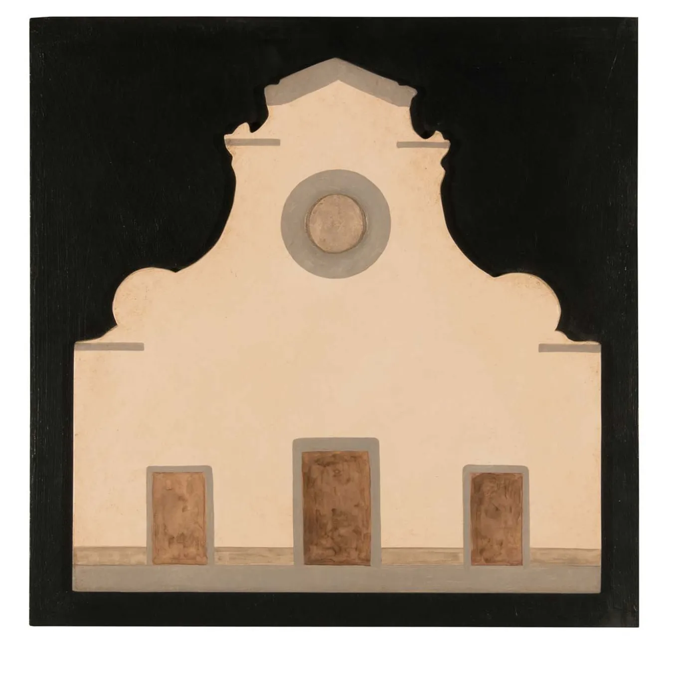 Sophisticated yet understated, this panel will be at home in a living room or study, imparting artistic flair. Made of repurposed wood, this panel features Basilica di Santo Spirito designed by Renaissance architect Filippo Brunelleschi, hand-carved, painted, and assembled over a black wooden panel. The silhouette is painted in an ochre acrylic tempera applied in the “encausto veneziano” style which complements the blue details in the rose window, doors, and roof. Admired by art lovers and novices alike, this panel is a one-of-a-kind piece crafted with utmost attention to detail.