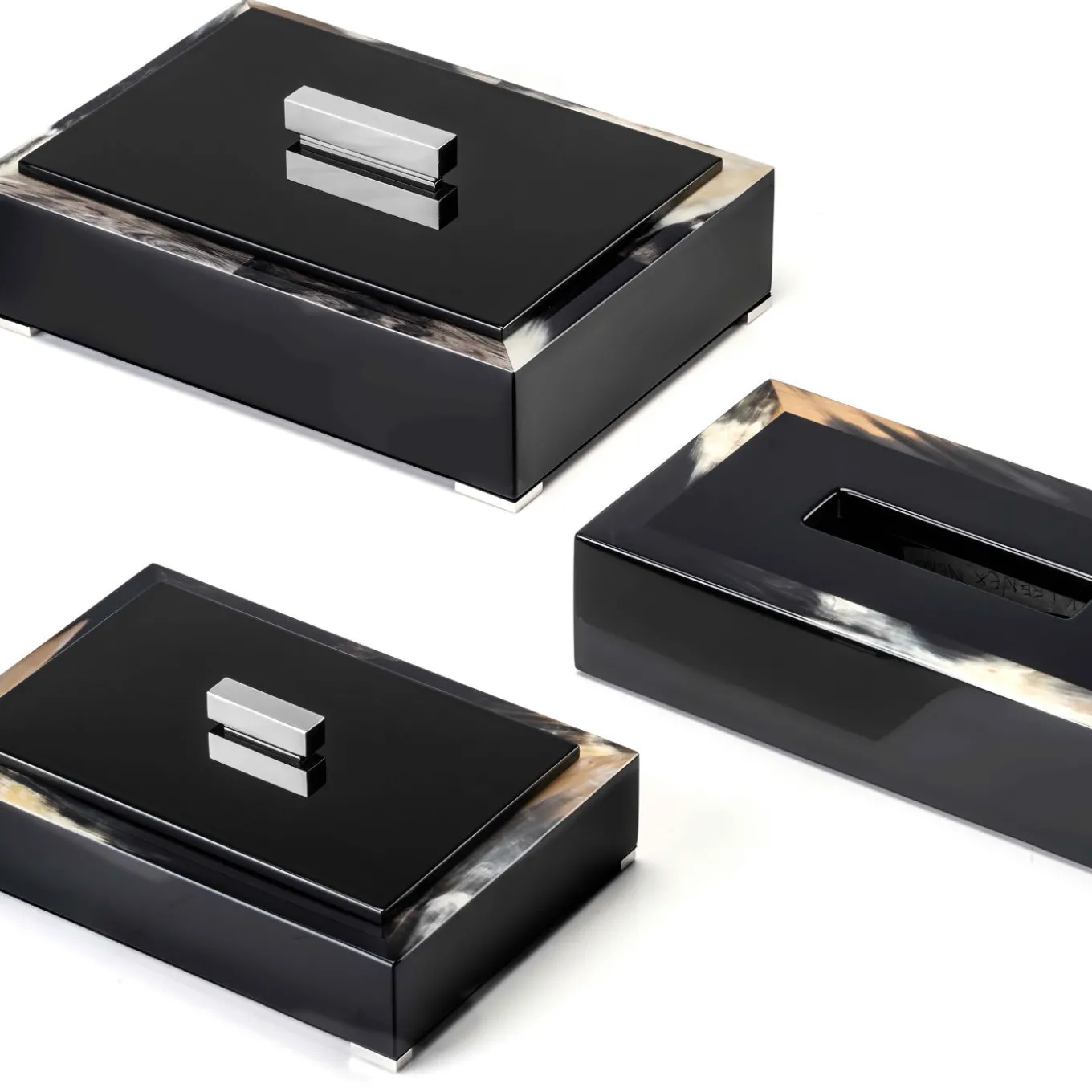 A stunning addition to a contemporary interior, this polished storage box is crafted using luxury materials interpreted with modern flair. Shaped like a parallelepiped, the box comprises a black structure in wood and prized, dark horn with a lacquered, glossy finish. The same finish adorns the wooden lid, which is equipped with a chromed brass handle. The internal lining in Tosca leather completes this sophisticated object.
