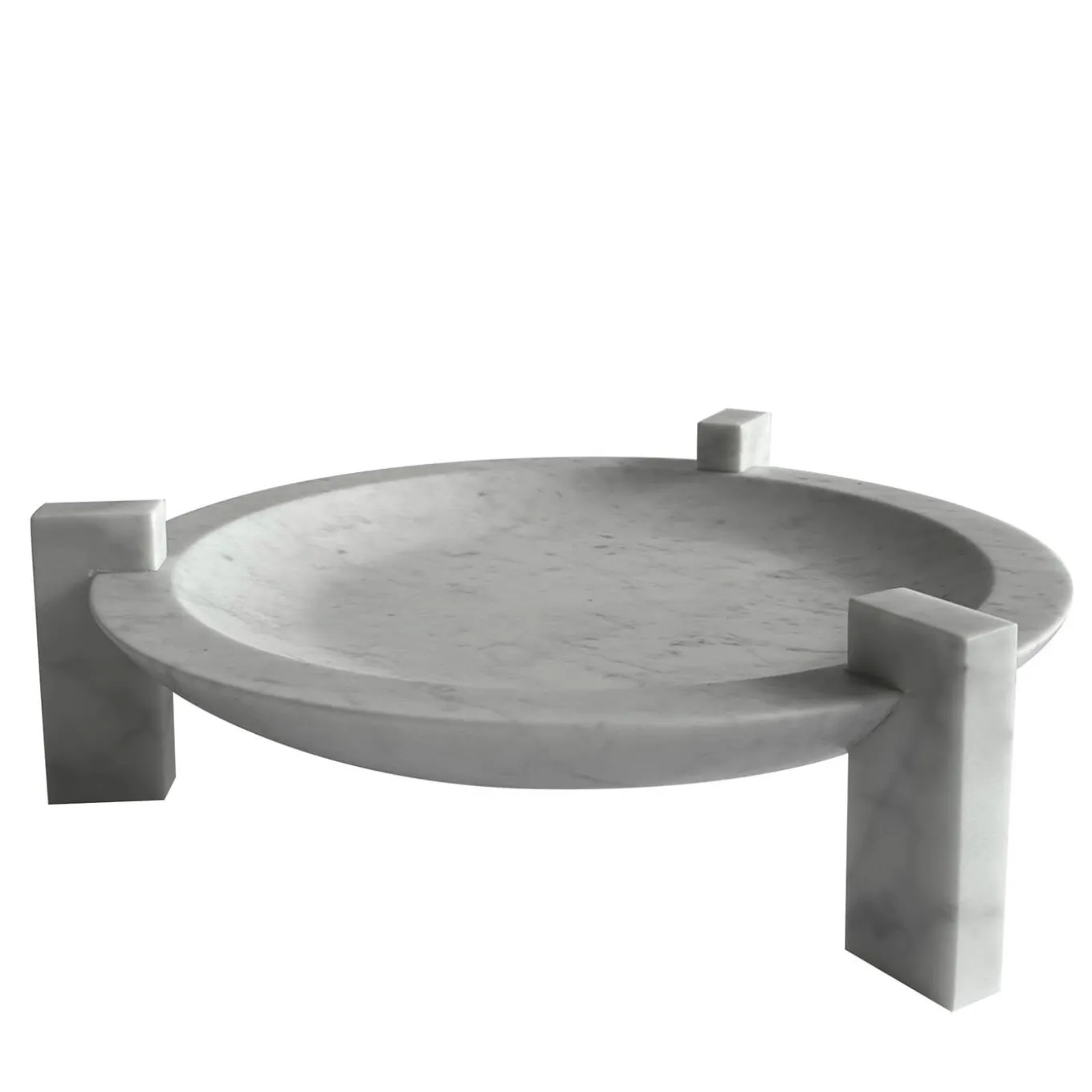 This marble centerpiece features a suspended circular plate supported by three solid parallelepiped blocks, creating a balanced and harmonious design. The natural veining and texture of the marble add a sense of solemnity and refinement. Its low-profile structure makes it ideal for enhancing various settings with understated elegance. Other finishes are available upon request. Contact the Concierge for more details.