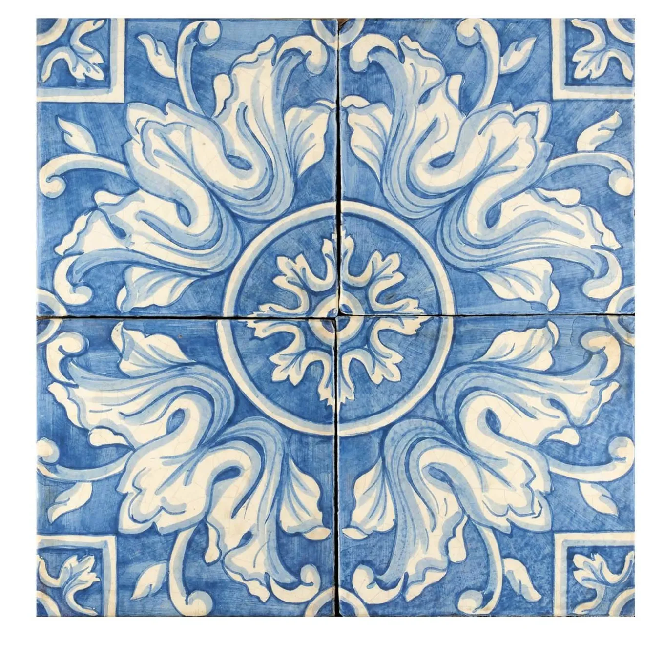 Effortless in their intricacy and beauty, these tiles will transport a piece of Sicily to any minimalist or rustic kitchen and bathroom interior. Forged of terracotta mixed with ground volcanic stone, these timeless tiles from the Natura Collection are distinguished by their intricate design revealed in a four-tile configuration: ivory-colored frond elements that flank the central floral design, while contrasting geometric shapes enhance the dynamic movement of forms and colors in the cerulean blue background. Tiles must be applied with minimal grouting to capture the seamless aesthetic.