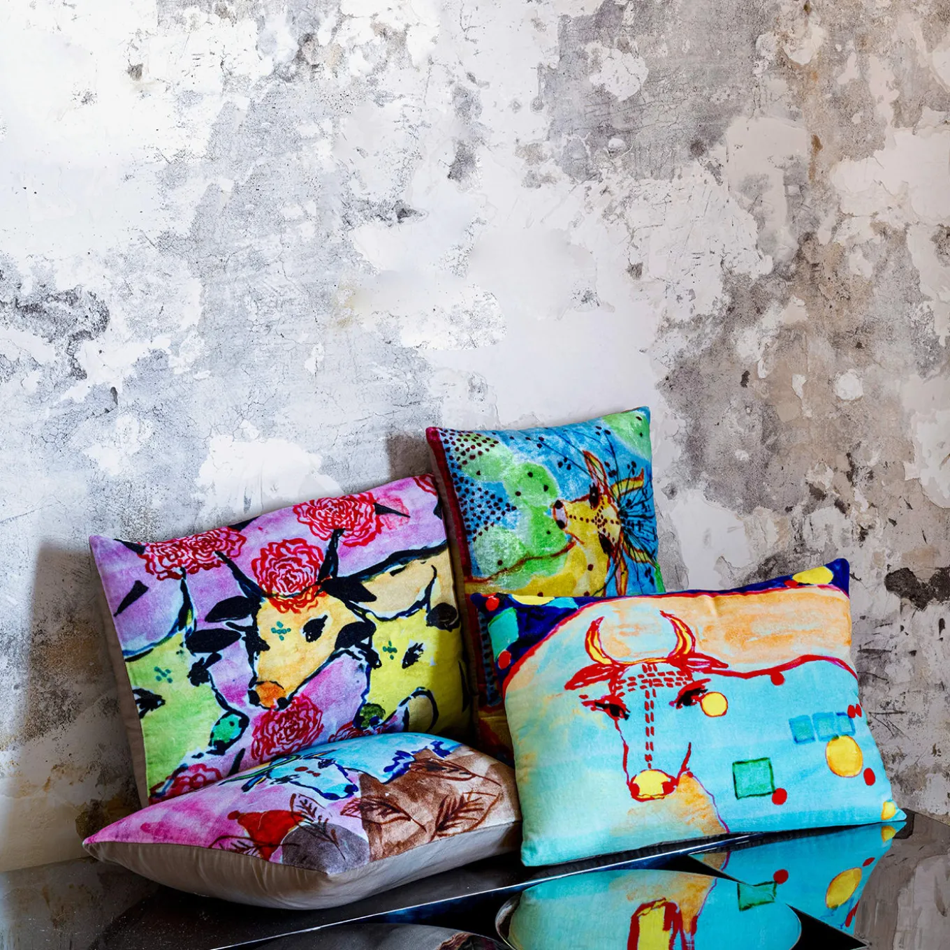 This cushion from the “cow line” collection is a unique work of art, a tribute to creativity. Crafted from luxurious silk velvet, this cushion is an explosion of color and an invitation to embrace the joy of living. The cow illustrations are not simply drawings; they are a homage to the past, reproduced from original sketches created years ago for an Indian orphanage. The natural kapok filling makes the Coralla cushion incredibly comfortable and sustainable.