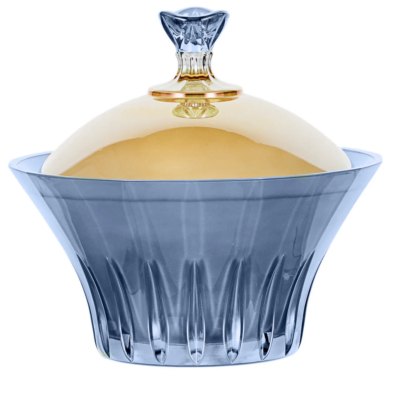 The body of this elegant box is entirely hand-crafted in a blue colored crystal while its lid is hand-manufactured in yellow colored crystal with a blue knob on its top adding an accent of vivid color. This piece is currently on show and immediately available at Artemest Galleria New York.