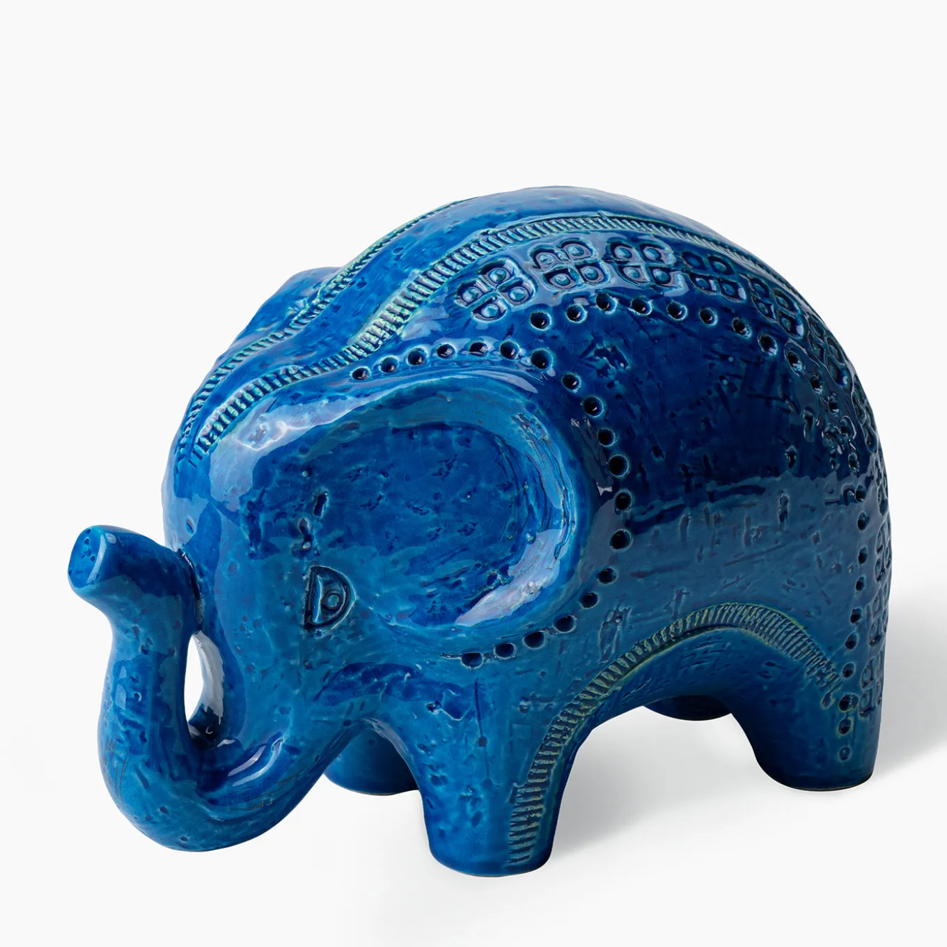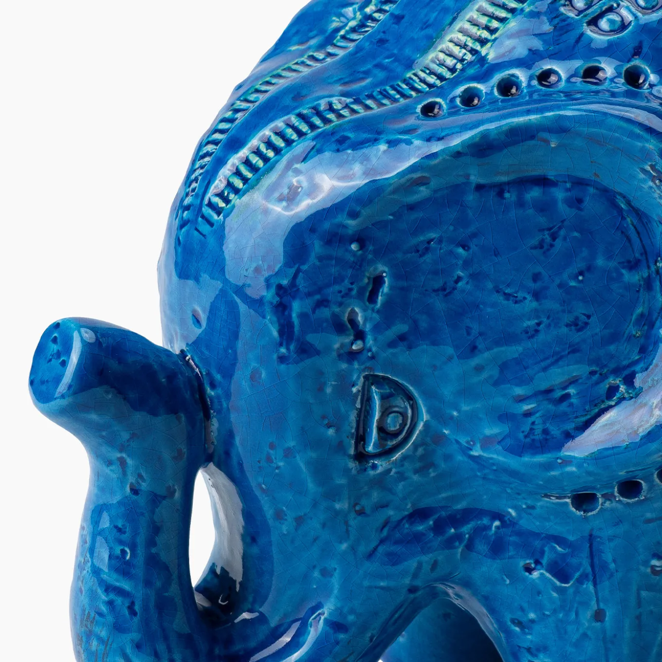 This medium-sized elephant figurine features a unique cast form from the Rimini Blu series, showcasing intricate stamped incisions in varied patterns under a glossy, vibrant blue glaze. The bright crystalline finish enhances textured details and subtle perforations along the body, creating a distinctive decorative piece ideal for adding a bold yet refined accent to any interior setting.