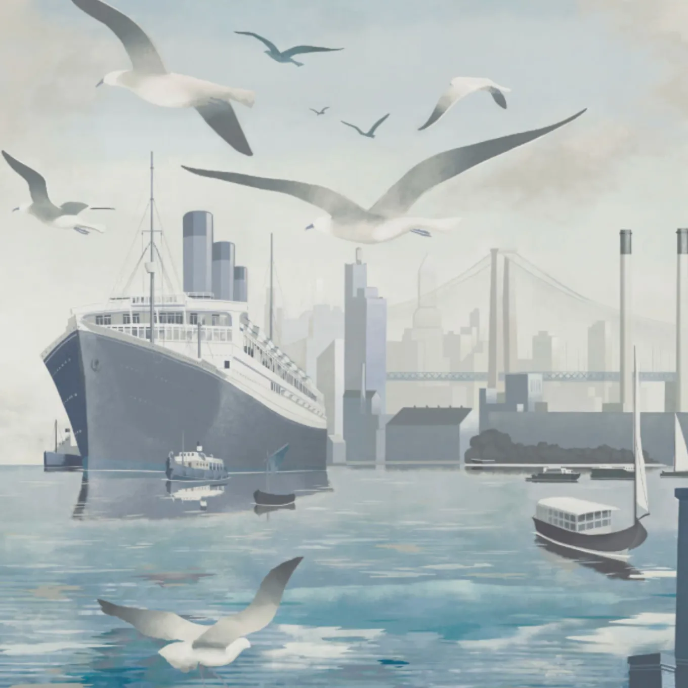 The Blue, Gray & Silver From Land to Sea Polyester Wallcovering Fabric was inspired by vibrant travel illustrations from the 1940s. This design encapsulates the essence of a bygone era, portraying an evocative New York skyline animated by hangars, docks, and transatlantic liners. Crafted with meticulous attention to detail, the fabric is digitally printed on high-quality polyester using advanced techniques. The installation process is streamlined and effortless. The piece features a unique double-width format, providing expansive coverage. The product is available in an alternative height of 270 cm and allows for selecting the desired scene and length to fit personal design preferences. The price is per square meter. Please contact the Concierge for additional information.