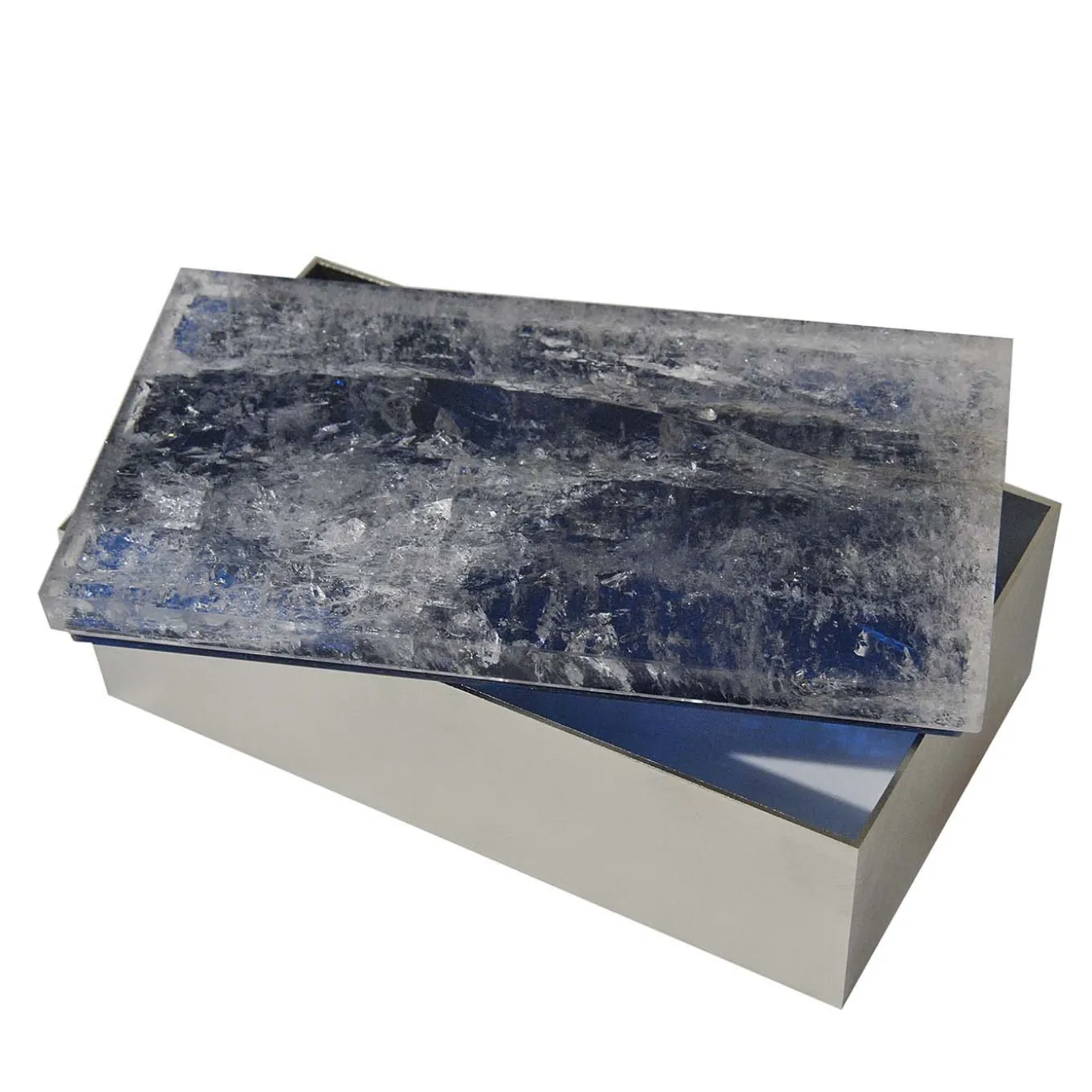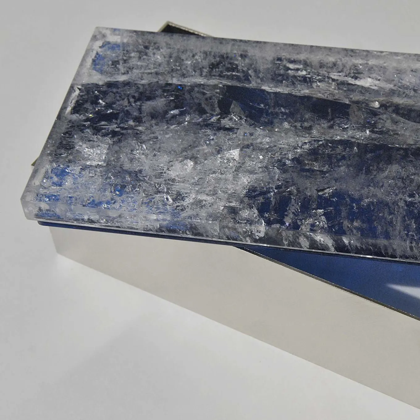 As a gift or part of a personal collection, this exquisite box is a superb addition to any jewelry display. A stately lid in deep blue quartz rests atop a rectangular box fashioned of brushed nickel-plated brass. The smooth texture of the brass and the roughness of the mineral lid create a stunning visual contrast that adds textural depth to the composition. Arranged with other boxes from the Tincani collection, this piece will add a chic accent on a console or side table.