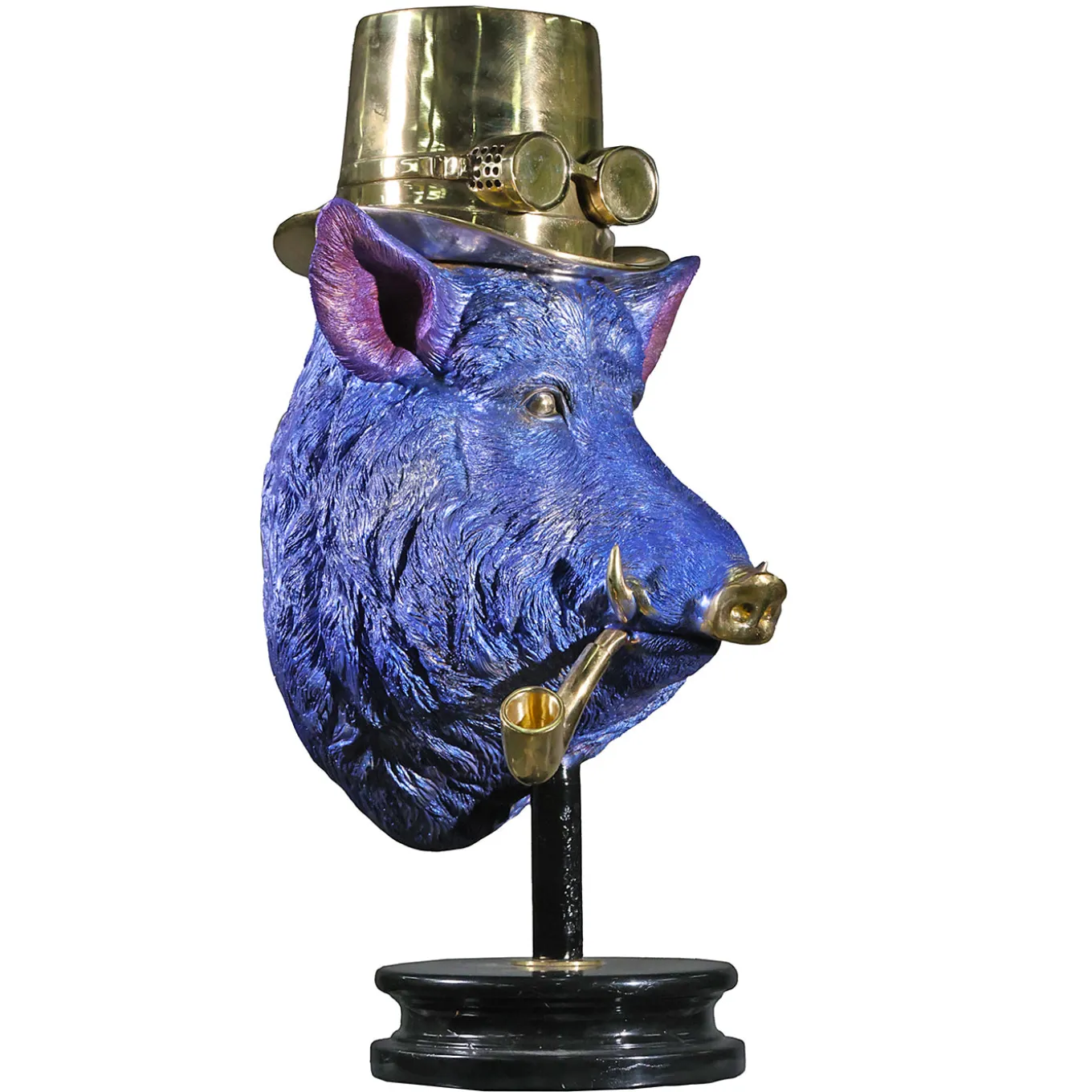 Boar sculpture with a striking finish and detailed texture, crafted using the lost wax casting technique. This medium-sized decorative piece features a unique combination of a blue surface and metallic elements, including a brass-like top hat, monocle, and pipe. Mounted on a black marble base, it adds an artistic and whimsical touch to any interior setting.