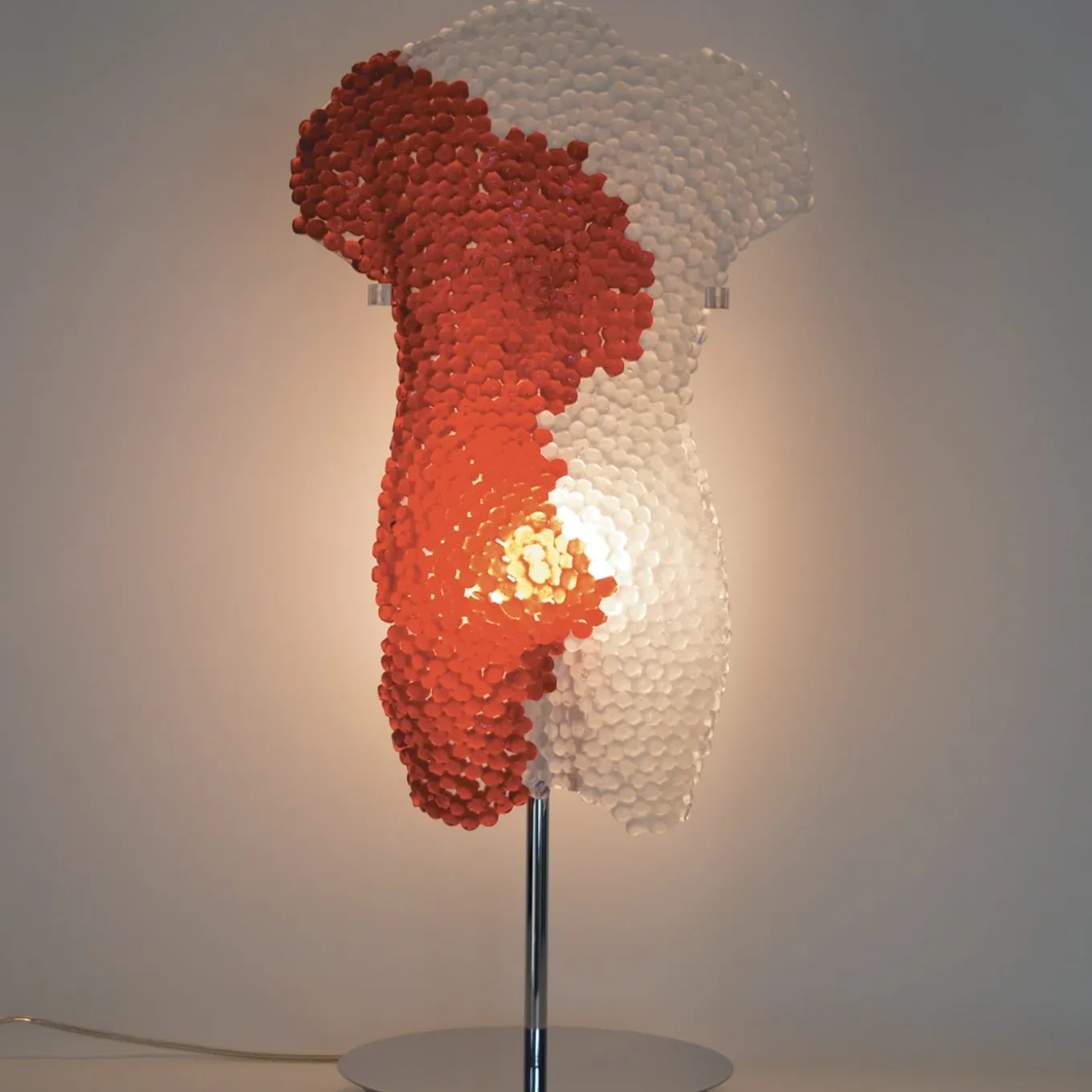 “Body” is a large-scale Murano glass sculpture. The body of the object is formed by pieces of red transparent glass and a crystal rod. The sculpture fits many stylistic solutions in any space. It comes with a chromed metal stand, specially designed Plexiglas elements to securely support the sculpture, and 2-light backlit system.