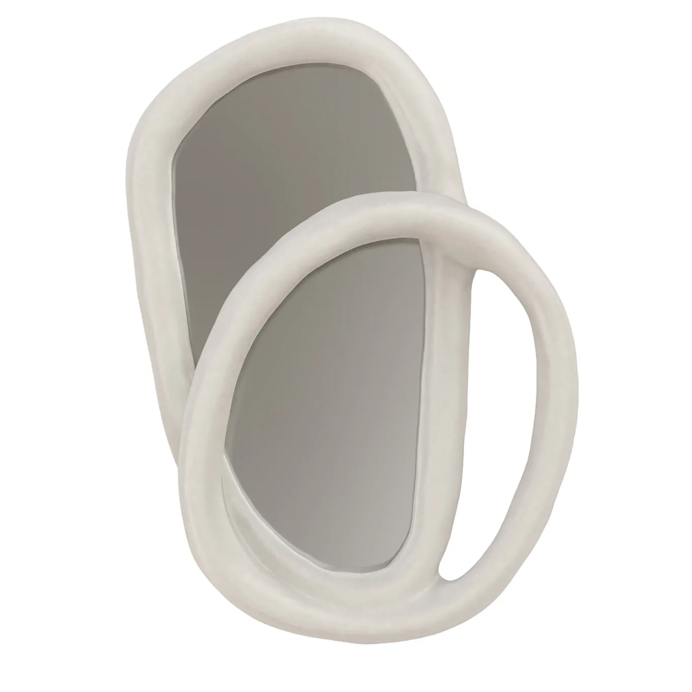 Large wall mirror distinguished by a three-dimensional frame that transforms it into a sculptural piece. The design features a ring embracing the mirror, overlapping with itself as it extends from the wall. Its frame has a textured, irregular surface achieved through multiple layers of putty and hand shaping, offering a unique, tactile aesthetic.