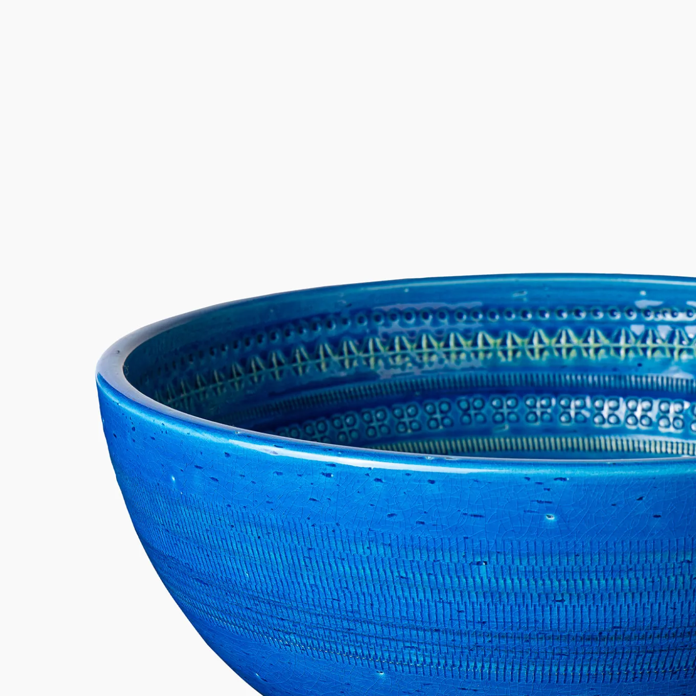 Crafted on a wheel using refractory white clay, this bowl features the rimini blu series’ signature hand-stamped incised decoration beneath a glossy blue glaze. The intricate patterns, varying throughout the design, create a refined texture and visual depth. Its medium size makes it versatile for everyday use or as a striking centerpiece. The vibrant blue finish adds a bold, elegant touch to any interior setting.