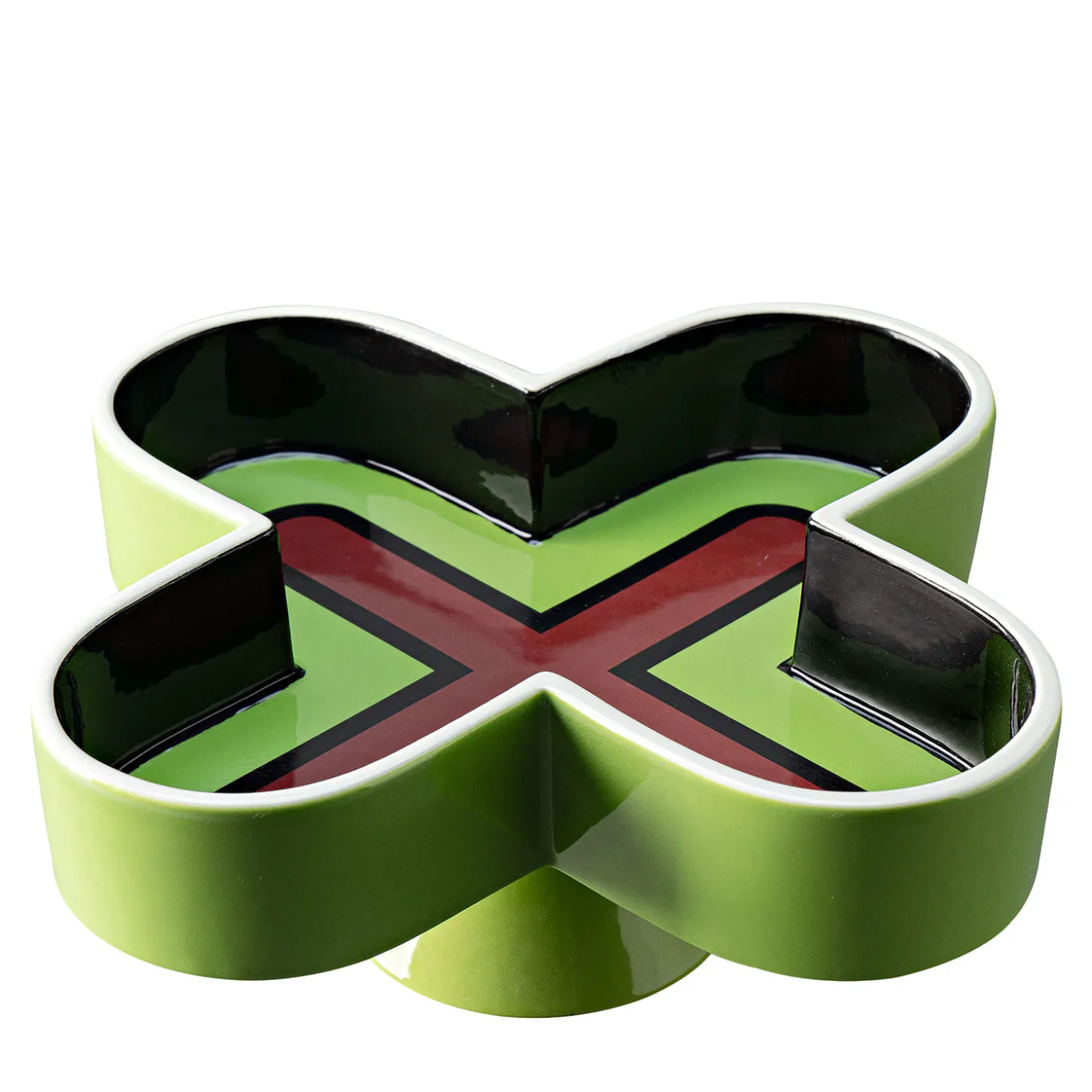 Bolo green centerpiece by karim rashid features a bold, sculptural form with a bright glossy green finish and a distinctive central cross motif in deep red, outlined in black. Crafted through a refined casting technique in white clay, this medium-sized limited edition piece (349 units) balances artistic expression with functional elegance, designed to captivate contemporary interiors with its vibrant color and modern, symbolic design.