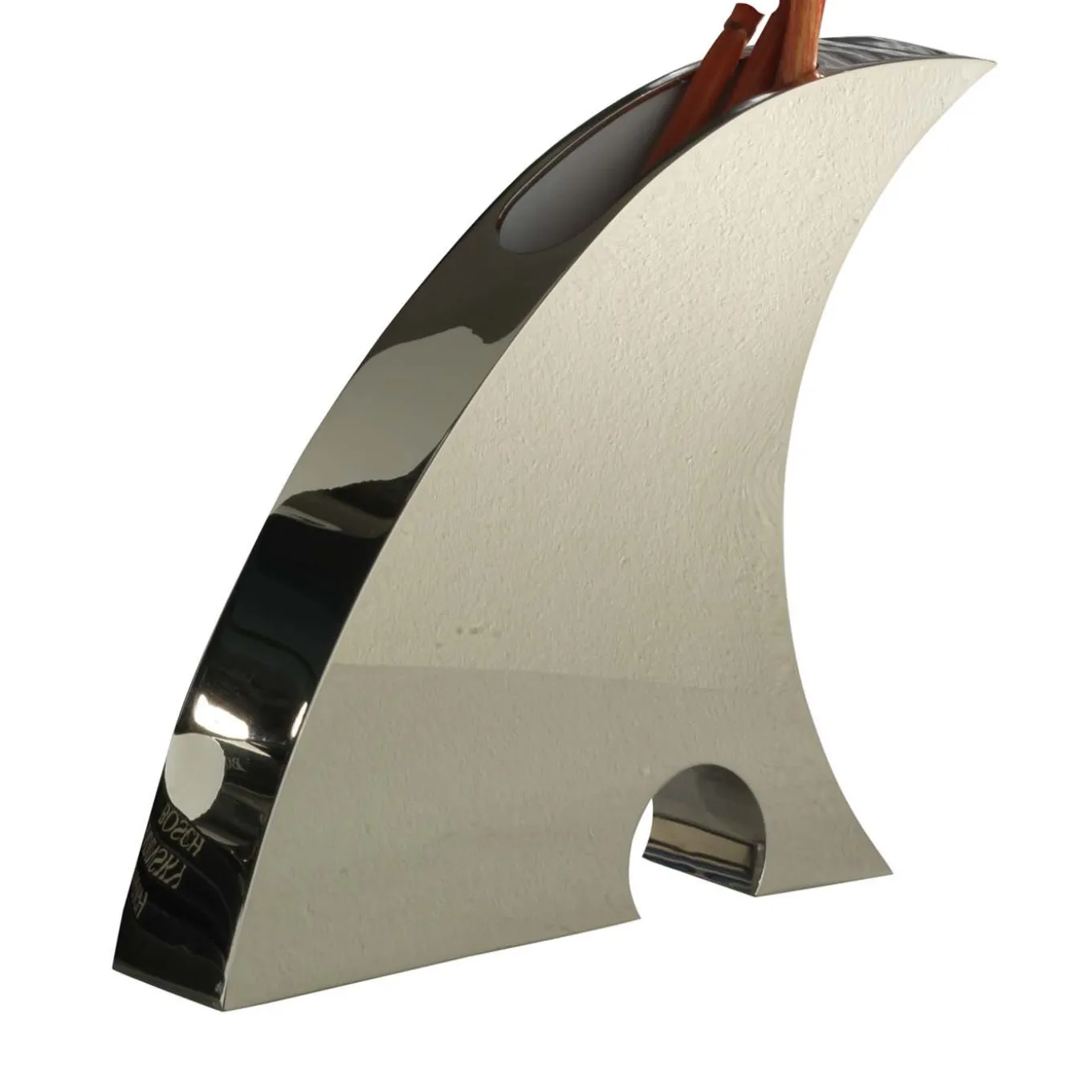 Distinguished for its highly contemporary and elegant design, this handmade vase will be a striking centerpiece on a modern console or minimalist coffee table. Fashioned of nickel-plated brass, this vase takes on a dynamic shape whose smooth contours recall a dorsal fin, catching the eye with its movement. The long sides of the vase are finished with a white varnish that elegantly contrasts with the brass for a striking textural effect. A small opening at the top makes this piece suitable for showcasing tall-stemmed flowers.
