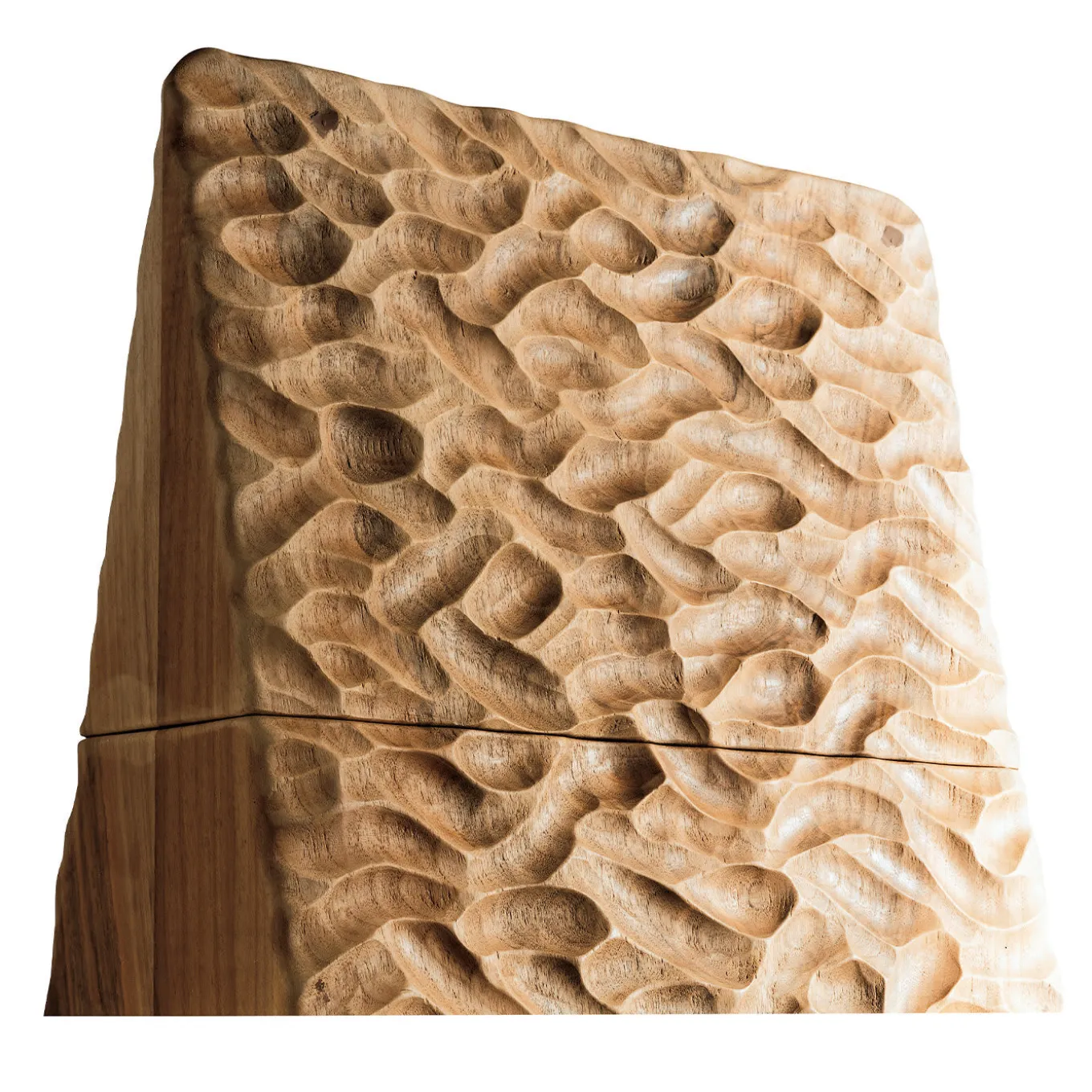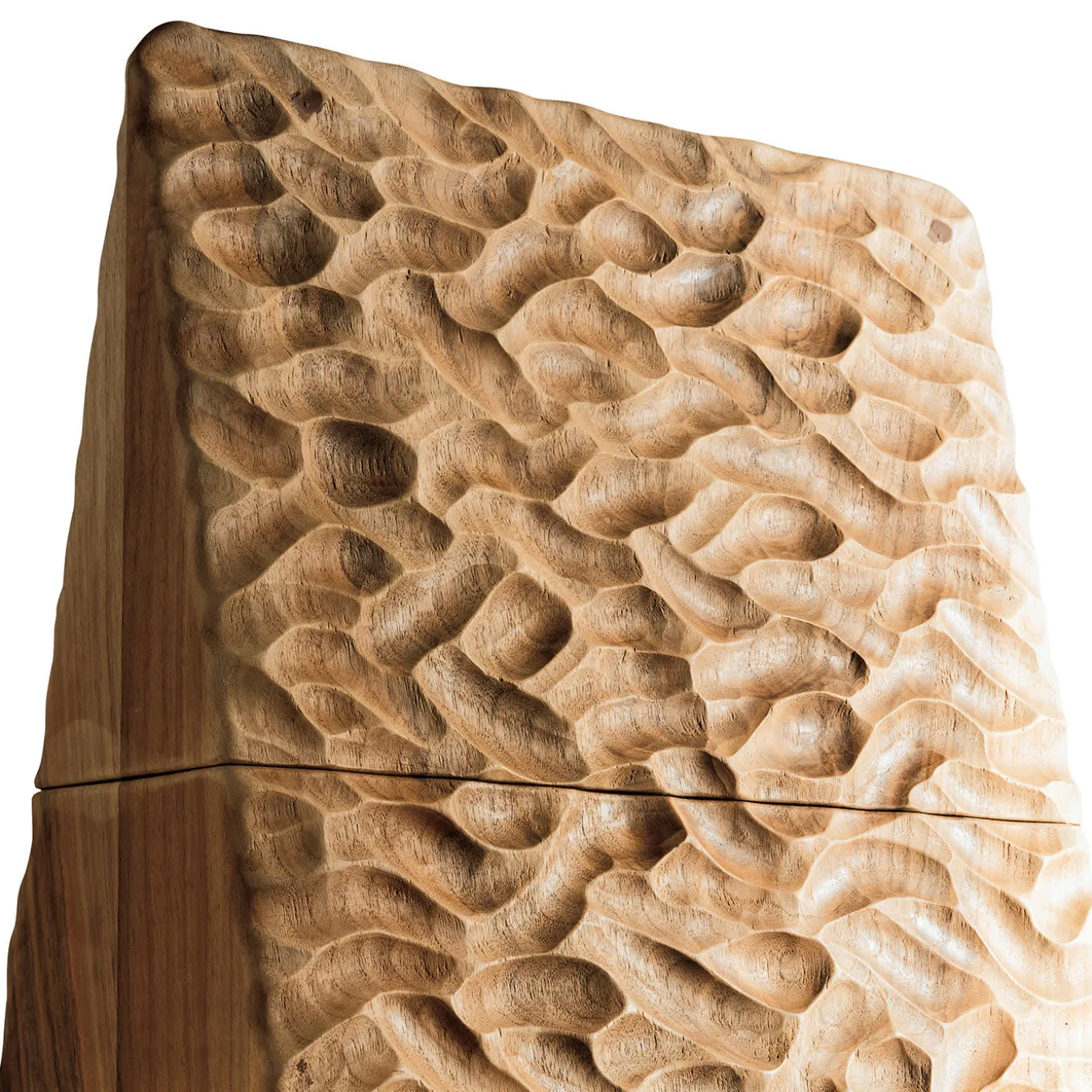 Designed by Giuseppe Rivadossi and superbly crafted by expert hands, this box is a refined and precious object showcasing the elegant marks of craftsmanship. Part of a limited edition of 14 pieces that come with a warranty certificate, it is entirely made of Juglans Regia walnut wood cut in 1994, left to dry during a period of six months, and then left for nine years in a protected but aired place. Its sturdy, pyramidal silhouette is finished by hand with a whitening effect and natural wax to enhance the interplay of lights and shadows created by the textured surface.