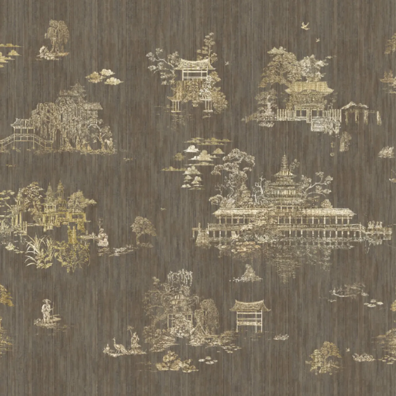 The Brown & Gold Hours & Blinks Polyester Wallcovering Fabric features intricate scenes of tranquil life set against a mesmerizing backdrop. Inspired by the elegance of Japanese decoration and 12th-century lacquered artifacts, the design utilizes gold leaf accents to accentuate its luxurious details. This fabric exhibits delicate shadows and light effects, offering a three-dimensional appearance. The color palette includes classic yet bold hues of gold and lacquer, alongside modern pearly pastel options, ensuring a versatile fit for diverse decor styles. The double-width design allows for seamless installations that achieve a sophisticated and continuous appearance. This piece provides customization options to fit various wall sizes and layouts and is available in an alternative height of 270 cm. The price is per square meter. Please contact the Concierge for additional information.