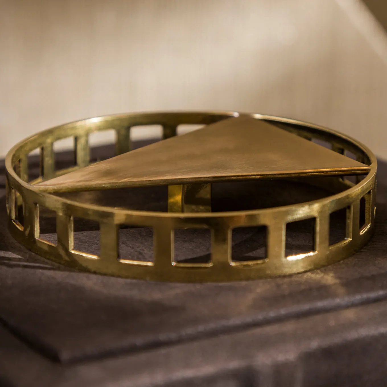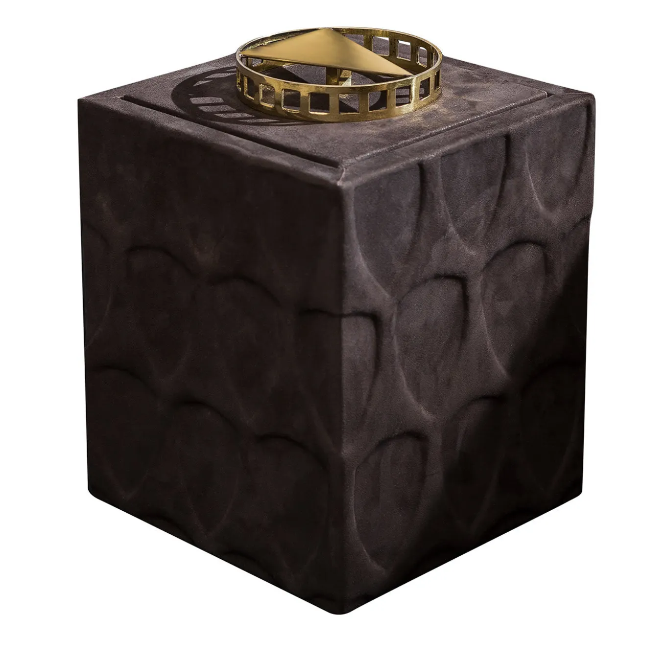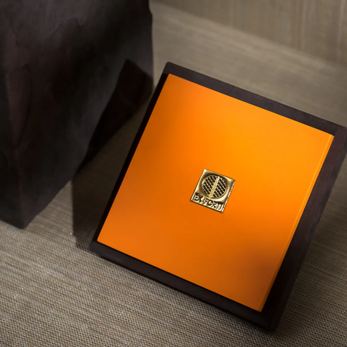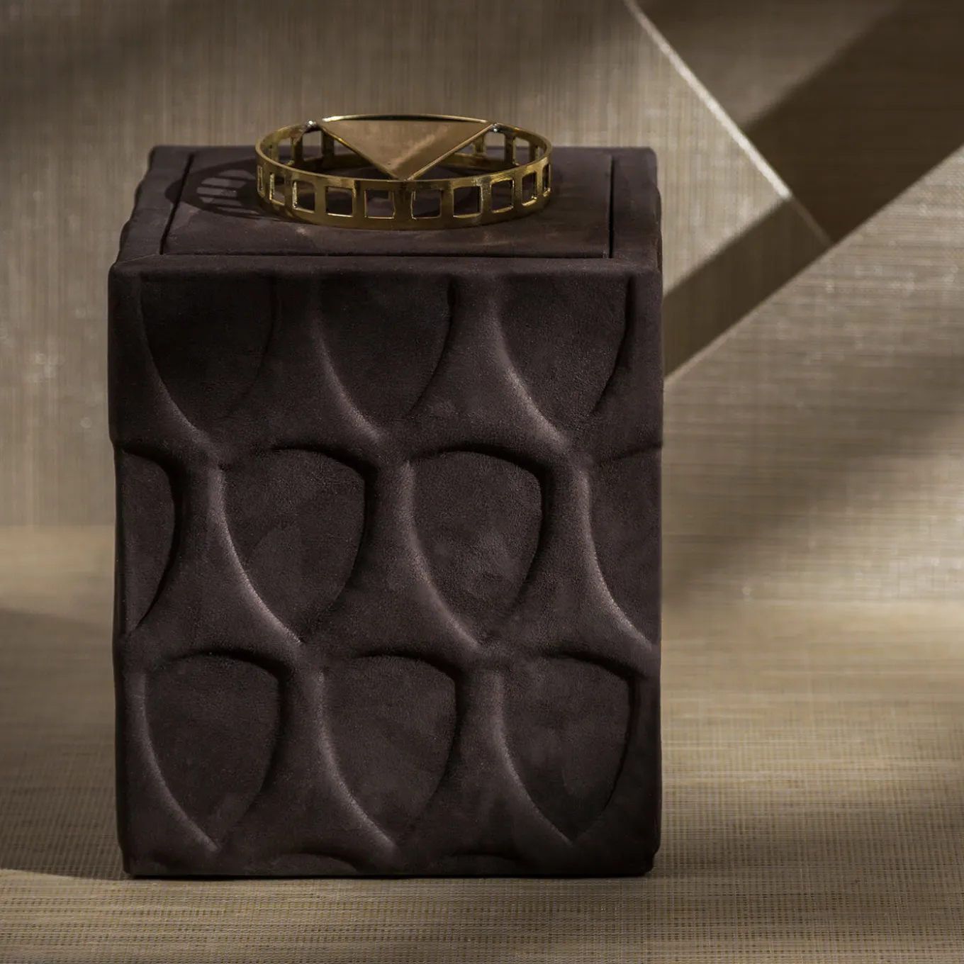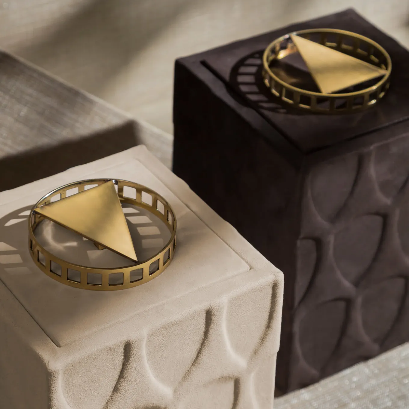 A clever synthesis of architectural references, this superb box features a sturdy, parallelepiped-shaped wooden structure marked by a repeated tectonic texture – an homage to Brutalism – that gets enhanced by the prized, dark-brown Nubuck leather that fully envelops it as a classy suit. The jewel-like brass knob allows the lid to be lifted to reveal the inner orange lacquer, while suggesting an elegant reference to the architecture of the Yale University Art Gallery by Louis Kahn.