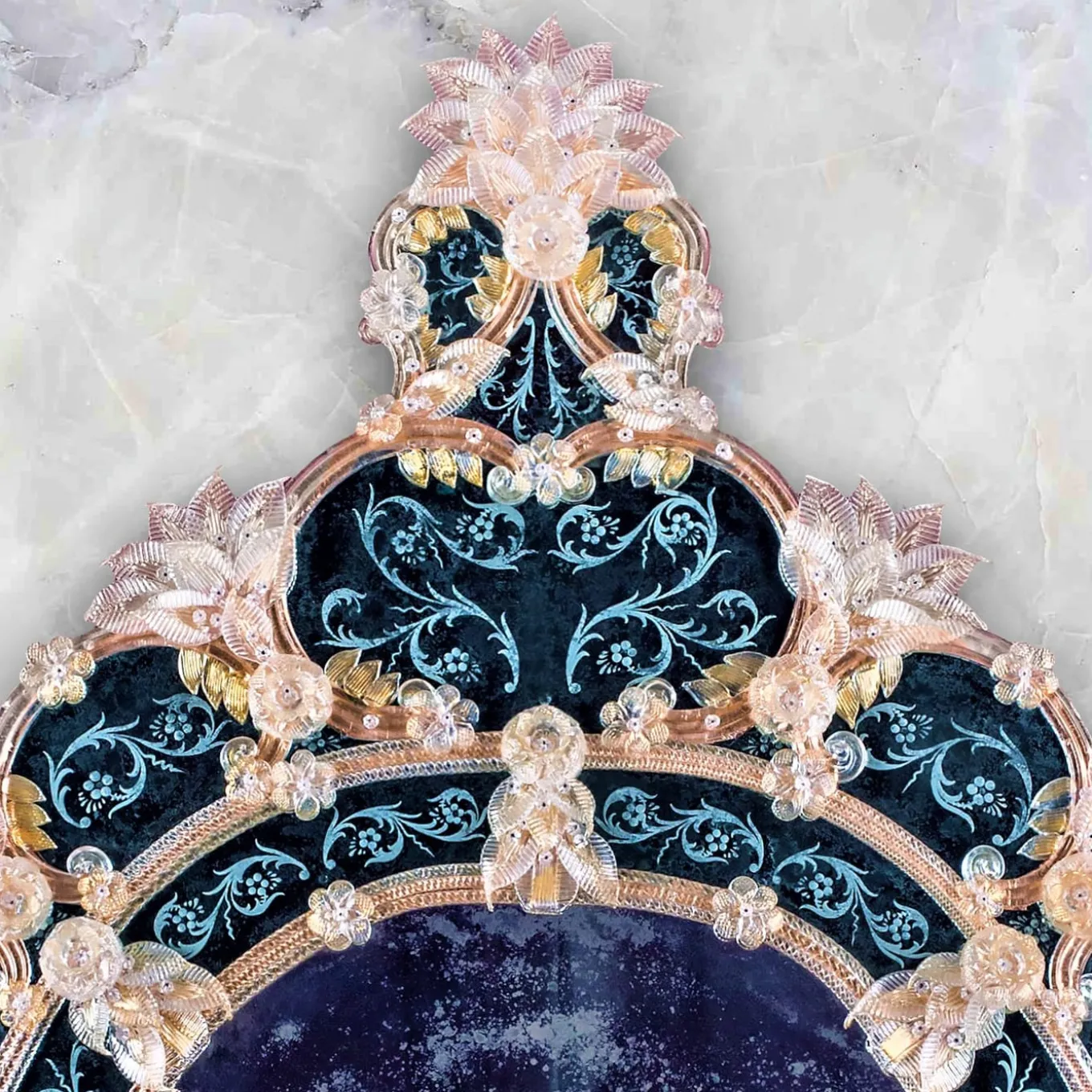 This piece of furniture is a reproduction of the typical Antique Venetian Mirror made in Murano glass, silvered with antique silvering entirely produced in mercury. This technique is typical of the 18th-century Venetian area. The entirely hand-made engravings are decorated with floral subjects. Both the internal and external frame is made of Murano glass curls, which are all finished, enriched, and embellished thanks to gold leaves, which are attached to the curls.