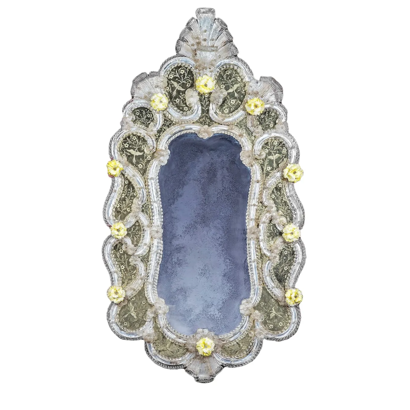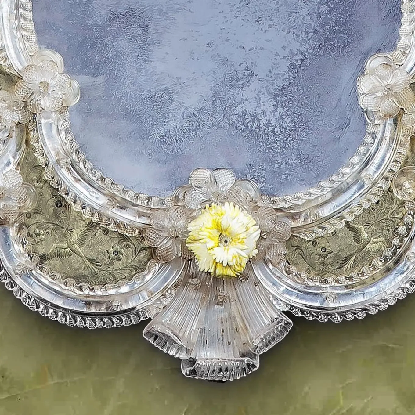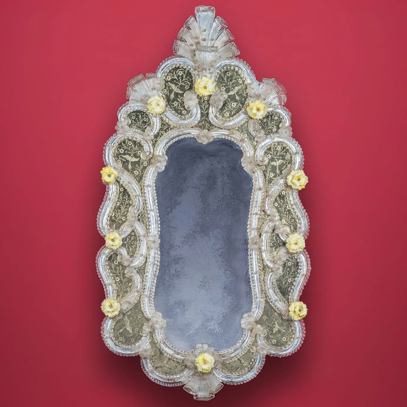 This piece of furniture is a reproduction of the typical Antique Venetian Mirror made in Murano glass, silvered with antique silvering entirely produced in mercury. This technique is typical of the 18th-century Venetian area. The entirely hand-made engravings are decorated with floral subjects and adorned with curls and birds. Both the internal and external frame is made of Murano glass curls, which are all finished, enriched, and embellished thanks to crystal leaves and glass flowers.