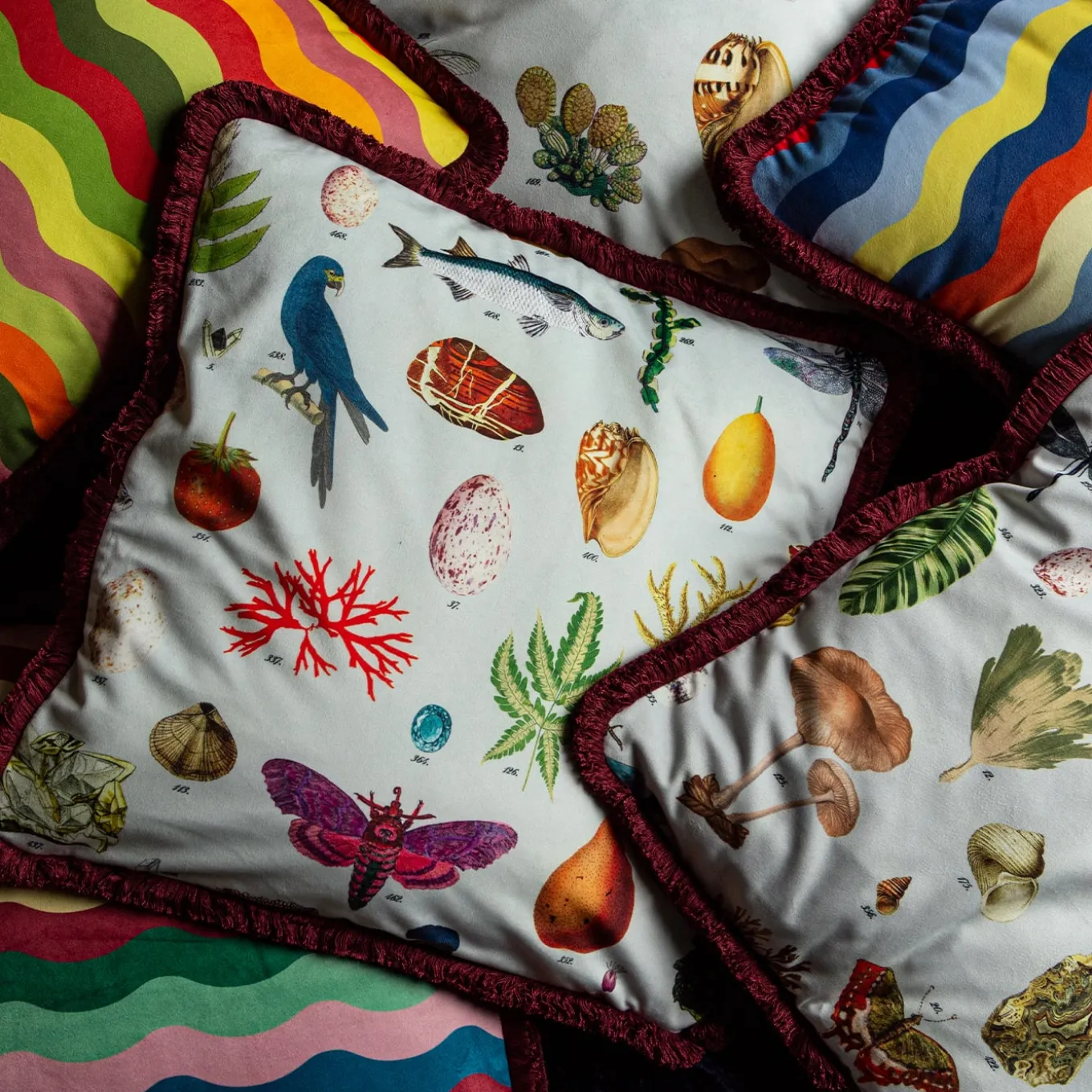 Part of the Cabinet de Curiosités, this elegant cushion showcases a wide range of natural elements and was printed on polyester velvet.
