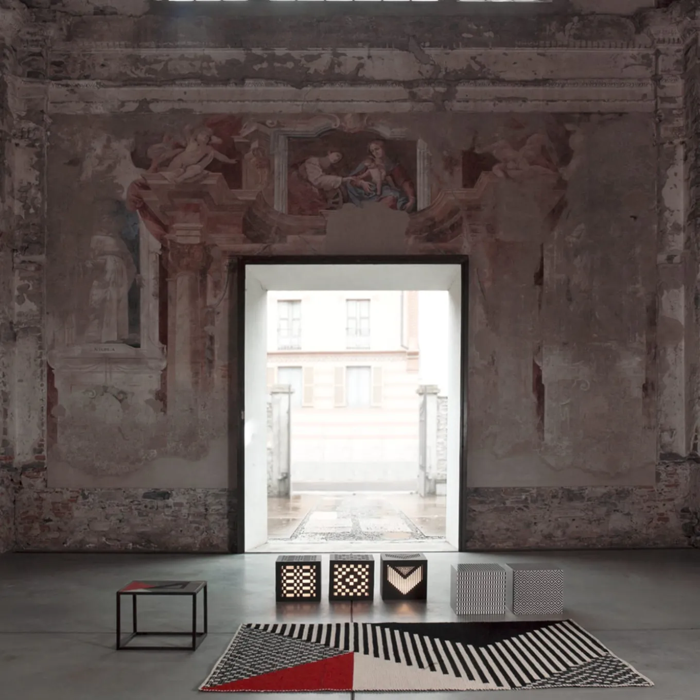 Designed by Inveloveritas exclusively for Extroverso, this exquisite rug in natural Sardinian wool is handmade on a loom by Mariantonia Urru using the traditional Sardinian pibiones and litzos techniques. Triangular shapes in different geometric patterns and solid colors in a black-white-red palette, mix in an abstract design rendered even more striking by the varying heights of the weaves. This rug will add artistic allure to any room in both modern and traditional decors.