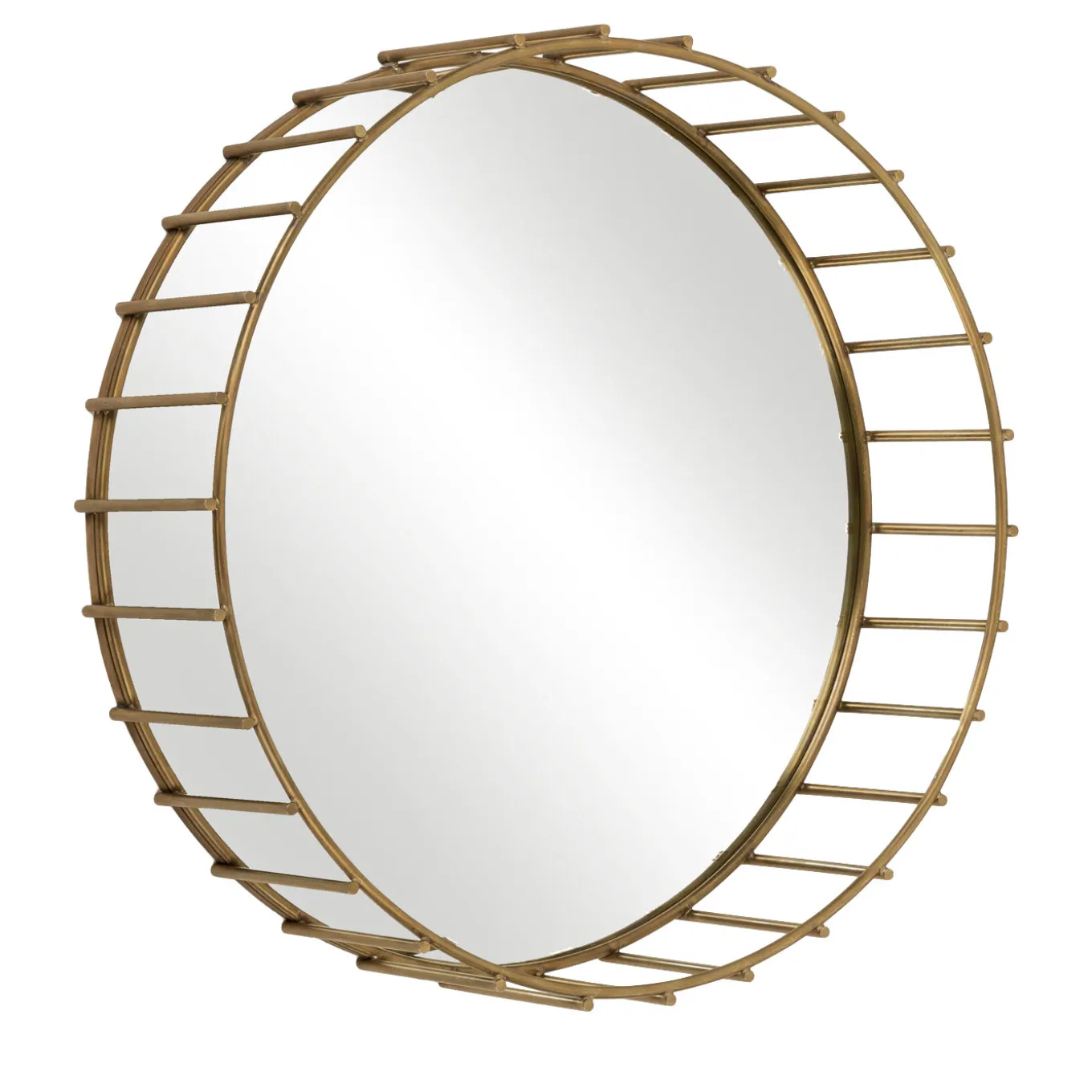 This elegant mirror is part of the Cage collection and can be paired with the lamps and the table from the same collection to furnish a sophisticated entryway or any other room in a house. Either paired with other elements of the same series, or alone, this round mirror will make a statement, thanks to its brass structure that features a round frame from which a series of short rods stem to connect to a second round frame, creating unique and interesting effects.