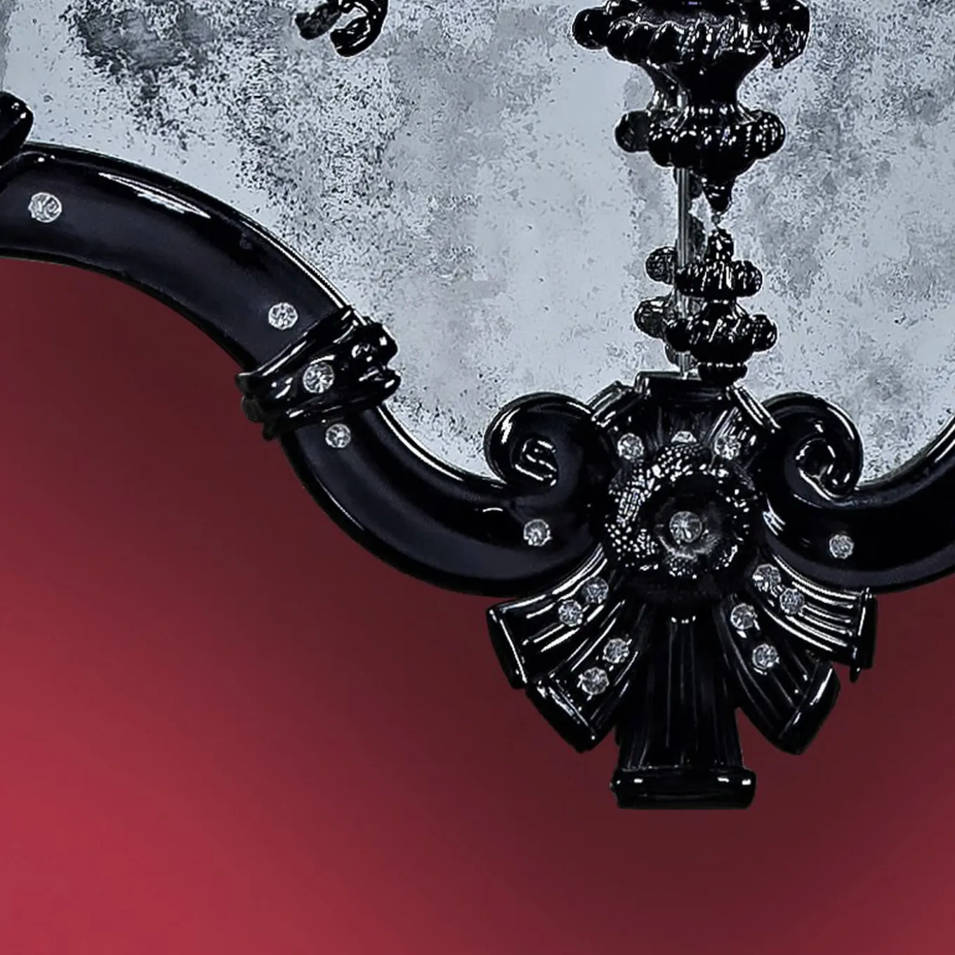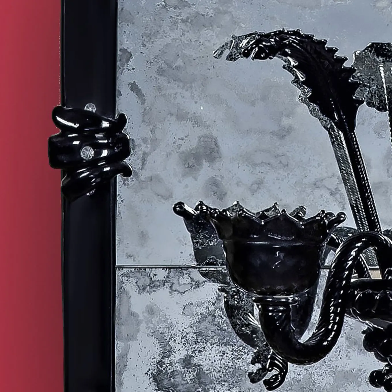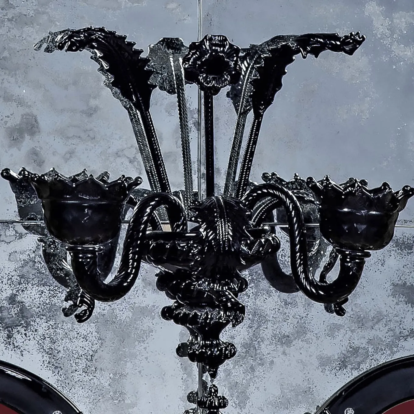 Iridescent mirror in Murano glass with the insertion of a two-light applique in the central mirror in typical Venetian style. Black applique, executed following the ancient techniques of our glass masters that handed down to the present day generates a unique work of its kind, with two functions, illuminating our homes with a mirror in total Venetian style, produced by Fratelli Tosi on Design by Fratelli Barbini Glass Mirror. The mirror composed of a black frame in Murano glass, is silvered and antiqued with pure silver, and then all finished with black leaves and flowers.