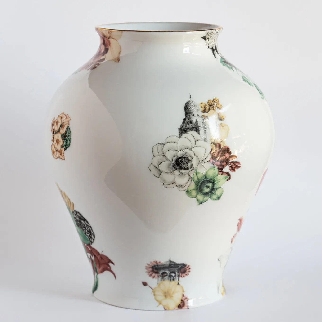 Designed by Vito Nesta as part of its signature Grand Tour Collection, this captivating porcelain vase is characterized by a classical shape revisited with a totally contemporary look. The unexpected combination of Middle Eastern architecture and floral design pattern in green, red, and yellow hues hand-painted over the sleek white surface makes this vase an eye-catching centerpiece for any table.