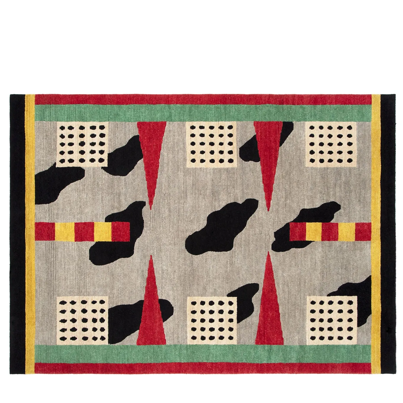 This striking wool carpet was designed in 1983 by Nathalie Du Pasquier. It is entirely hand-woven and boasts a series of geometric elements creating a symmetrical pattern enlivened by a striking use of contrasting colors and by asymmetrical cloud-shaped decorations that randomly occupy its mint-green background. The result is bold and unique and will imbue with eclectic flair any room in a modern or contemporary interior.