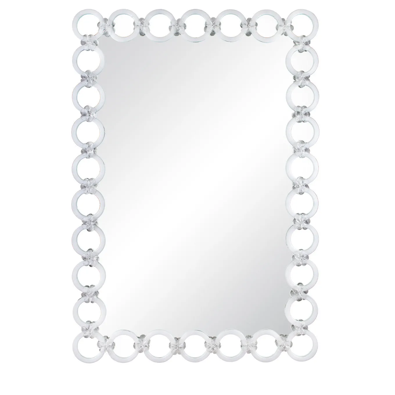 Completely personalizable in size and color, the Calle Rotonde Wall Mirror is an original style for any space and decor. The rectangular mirror is placed on a wooden support and framed with glass rings, forming a unique chain effect. Choose neutral colors for a traditional look or bright shades for a contemporary splash.