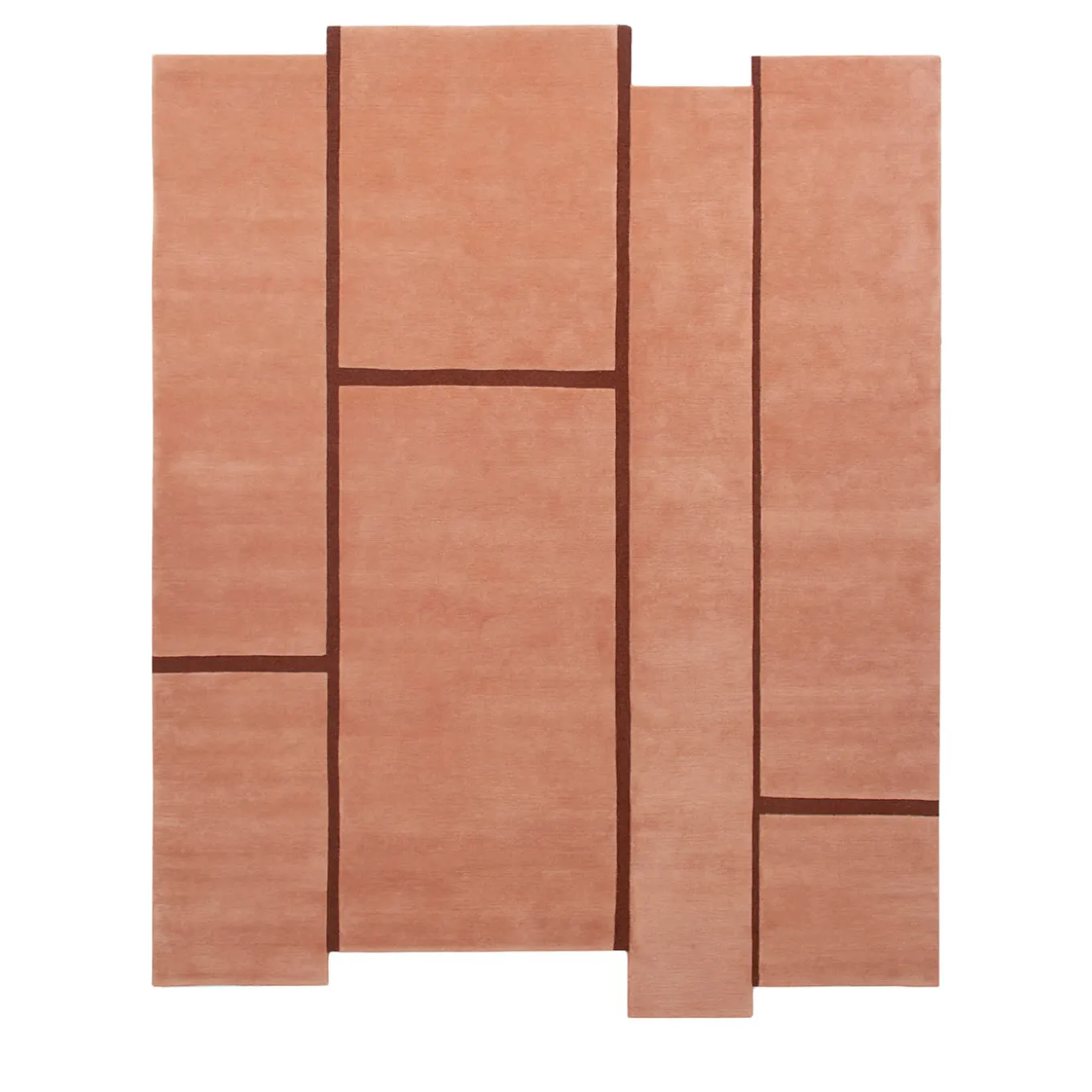 A gorgeous design from the Campiture series of carpets designed by Elisa Ossino, this exquisite piece symbolizes the contrasting yet harmonizing relationship between line and color. Rendered in rose and brown shades and preciously hailing from India, it is knotted by hand using 100% New Zealand wool.