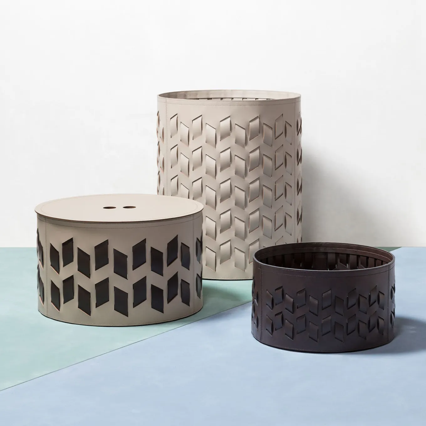 The Cancun baskets are characterized by a weave that develops only through vertical dotted lines that, being cut diagonally, give life to a design that reminds of the warm and retro atmospheres of certain fabrics typical of Central America. Finest regenerated reinforced leather structure with water-resistant and UV-resistant finish. Non-slip waterproof rubber base underneath. Fit for both indoor and outdoor use. Other colors are available. Please ask Concierge for details.